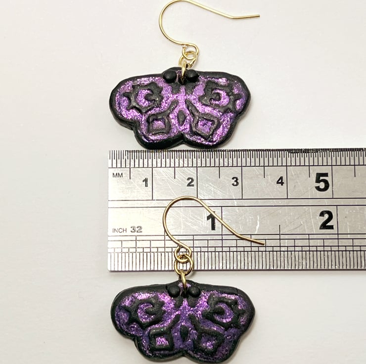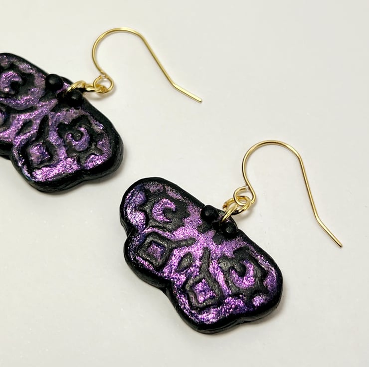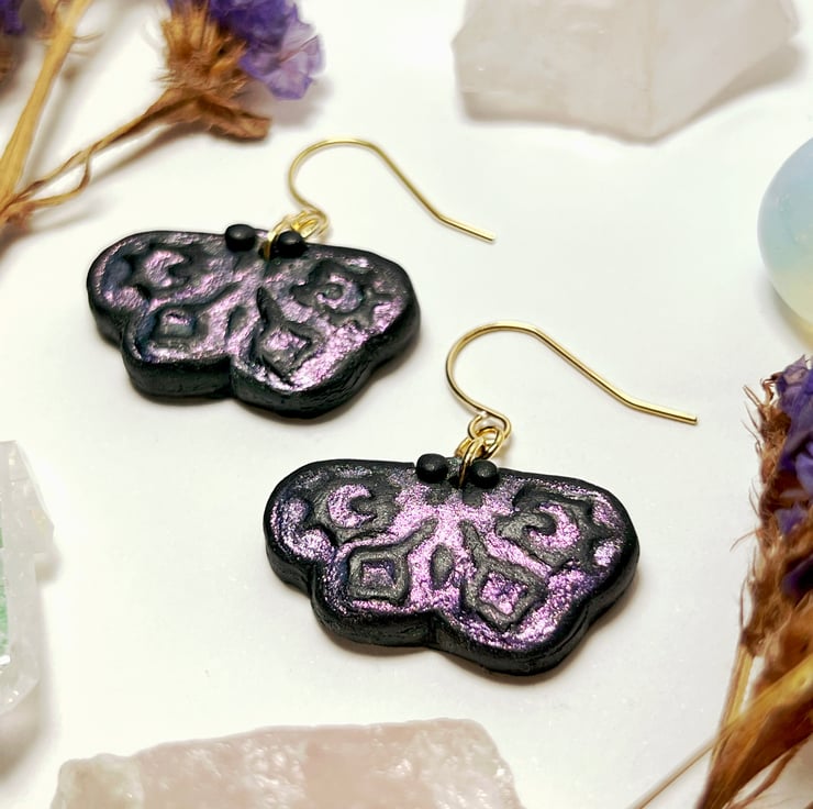 Polymer clay moth earrings in black stamped with a pretty shimmer pattern which looks a different shade of purple depending on how the light catches them.