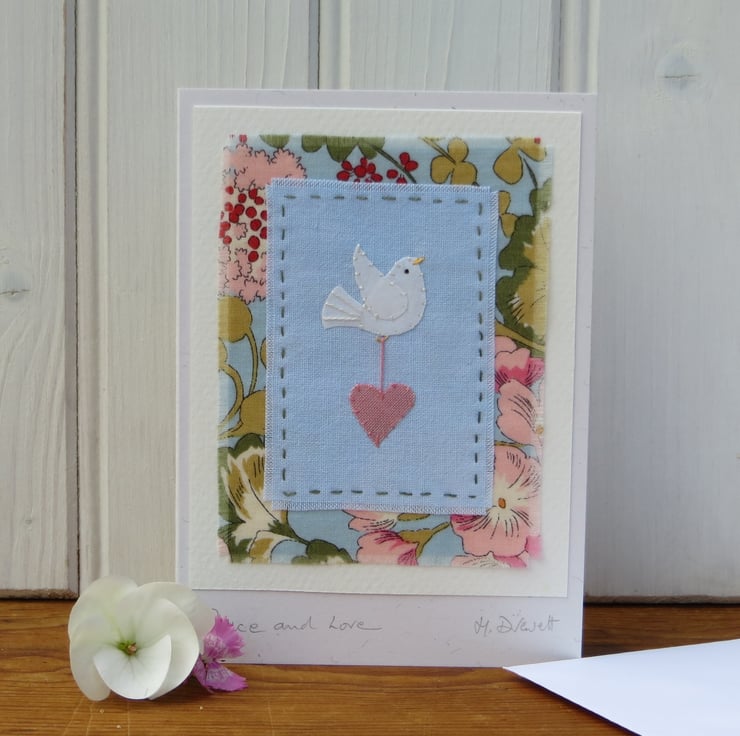 This little applique dove and heart design is made up of very pretty cotton print fabric teamed with a piece of hand-dyed recycled cotton on which I have worked a miniature applique dove. Everything cut and stitched by hand, to make a unique and lasting original piece of textile art. Perfect for new baby, first birthday, Christening or to go with baby shower gift. Suitable for weddings or engagement too!