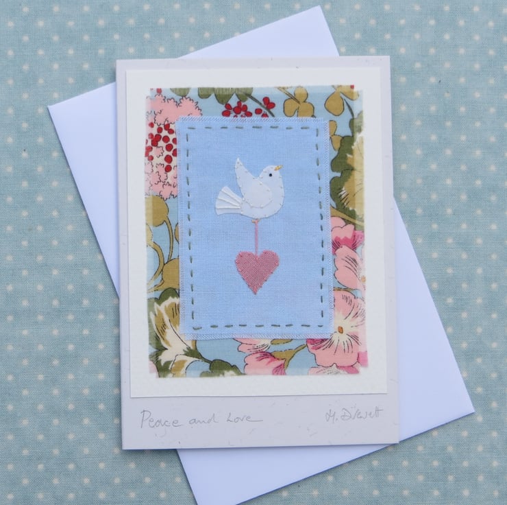 I have been making my hand-stitched miniatures for over twenty years, always designing and making new work, but some of the originals have stood the test of time, and this design called 'Peace and Love' is one of them. Useful for many different occasions, this simple image has remained popular for many years.