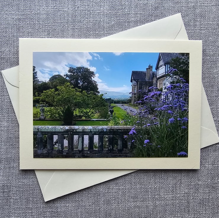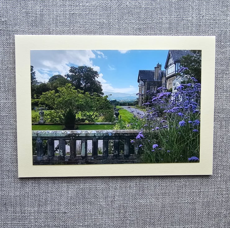 A scene from these beautiful gardens in North Wales, overlooking the Conwy Valley towards the Carneddau mountains. On the photo, in the background you can glimpse the mountain. in the foreground, the house and some beautiful purple verbena bonariensis.