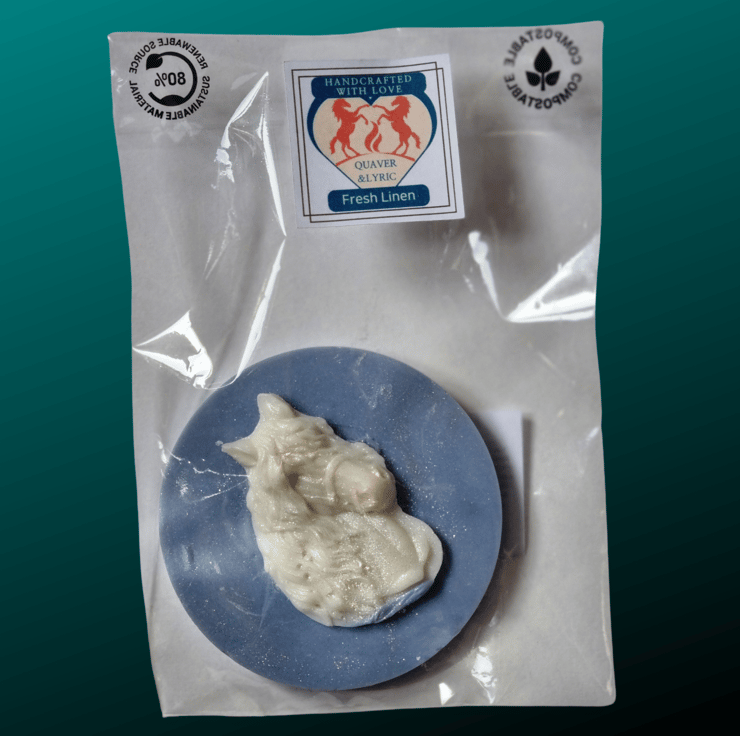 Highly scented handmade blue soy wax disc with white horse head. Handcrafted with premium-quality, responsibly sourced soy wax and infused with Fresh Linen - a fragrance with top notes of violet, orange blossom, jasmine and lily, base notes of amber and musk. The melts are finished with a light dusting of ice mica to add a shimmer. These melts make a lovely small gift for horse lovers who use wax melts.