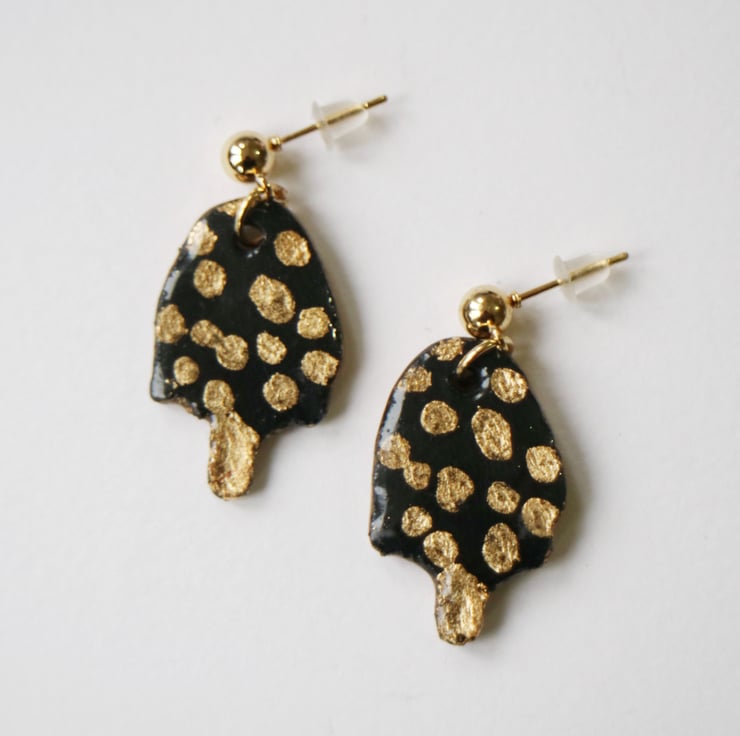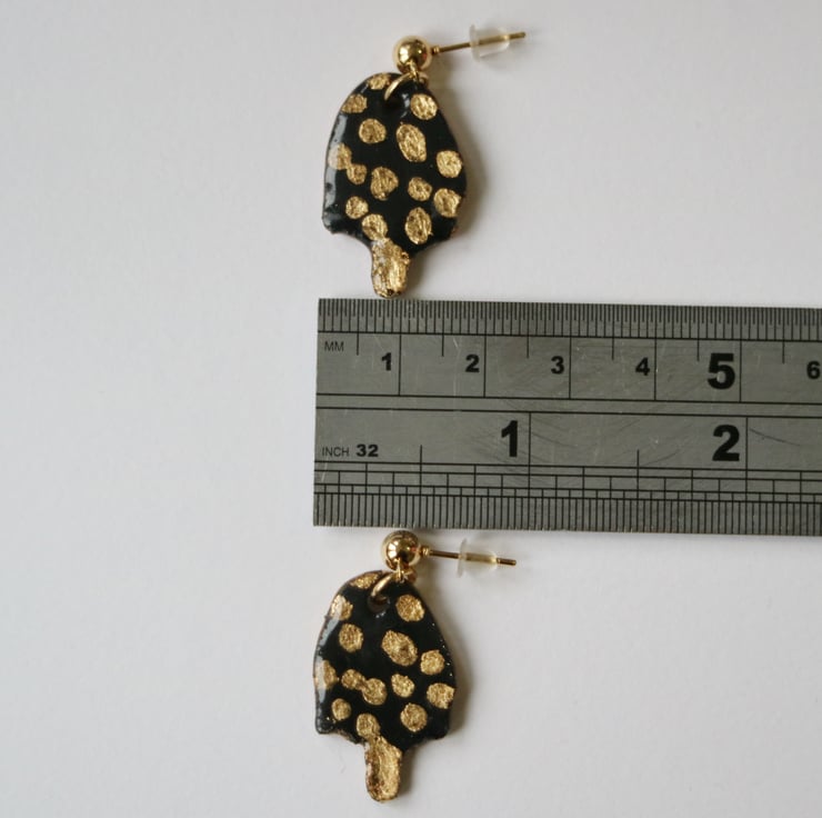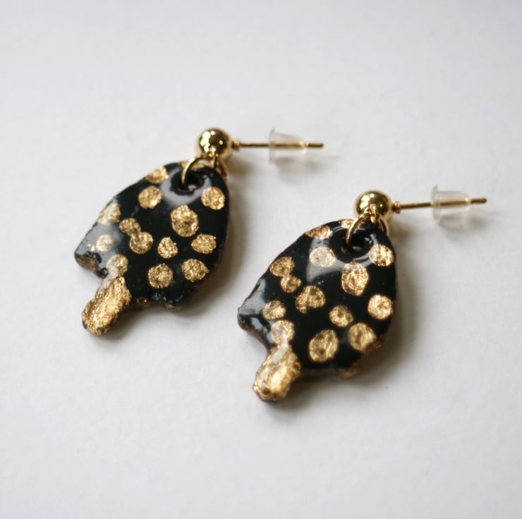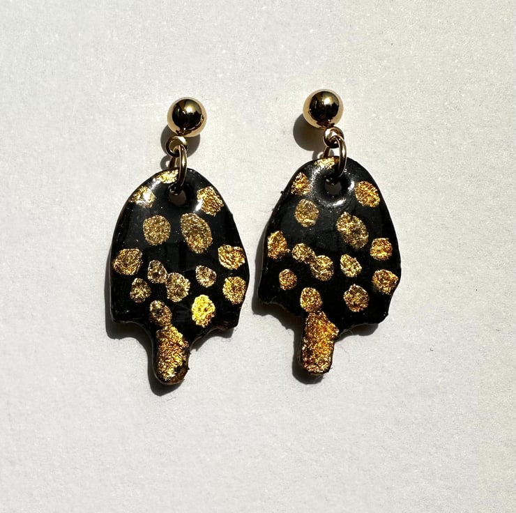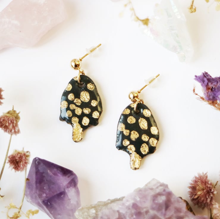 Hand made resin toadstool dangle earrings painted with real gold leaf details. The earring studs and findings are gold plated and lead and nickel free.