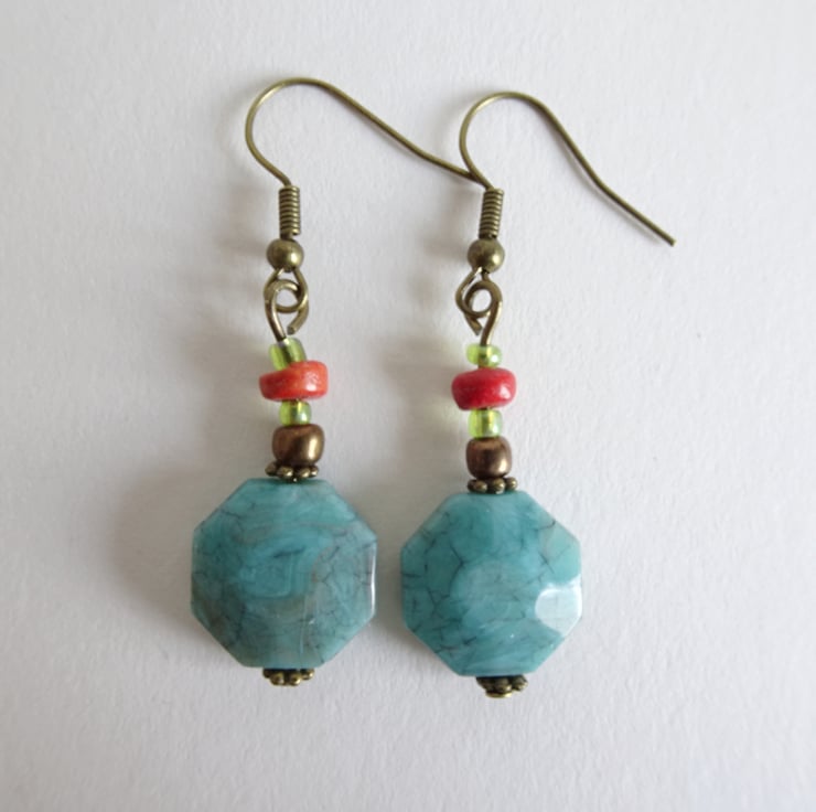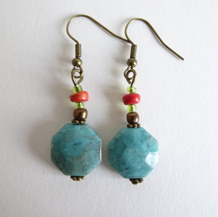 Orange Lime Green Brown Beads Turquoise Octagon Bead Bohemian Dangle Earrings