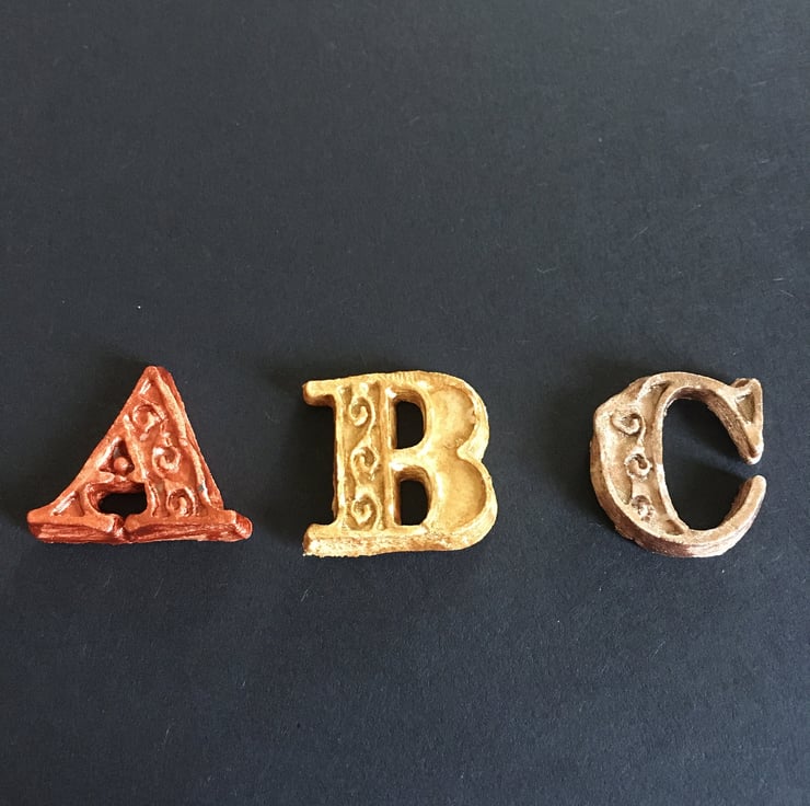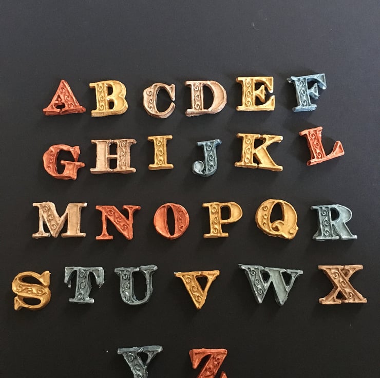 Lightweight letters, ideal for card making, scrap booking or memory books. Handmade to order, you can choose a whole alphabet or individual letters x26 and select the colour. Painted in acrylic. Approx 1cm tall.
