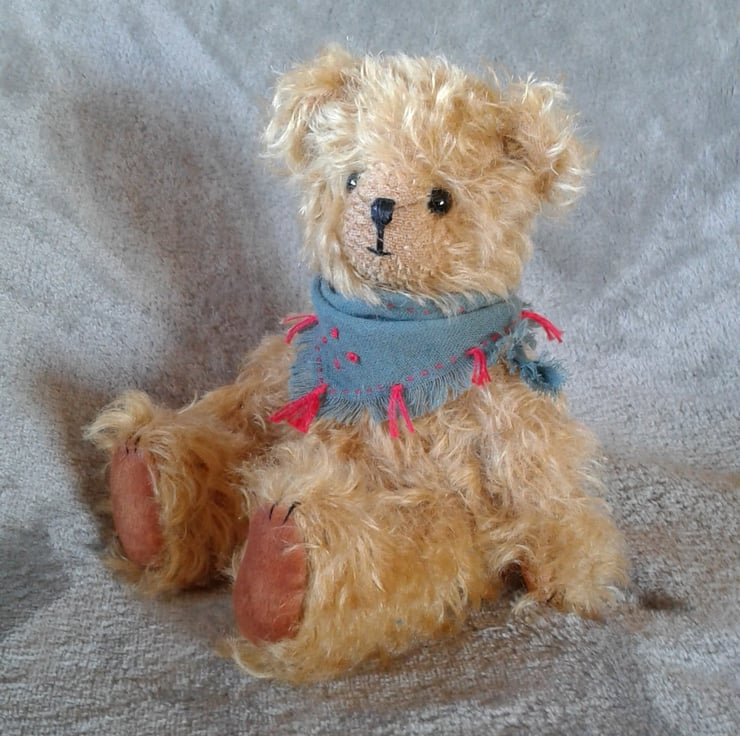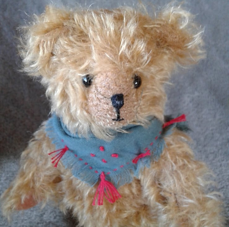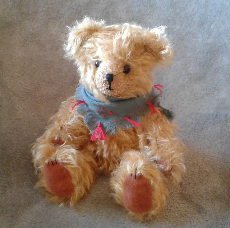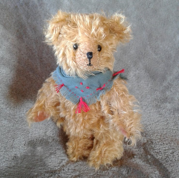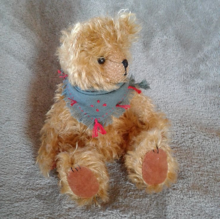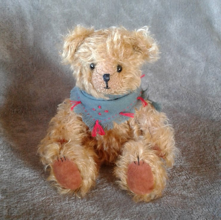 This little bear is made from a beautiful Schulte Mohair fabric which is soft and has a shaggy weave to it giving quite an unruly effect. Hence the name 'Iggy' he's a 'real wild child', well that was the idea but he is just a sweetie pie really.