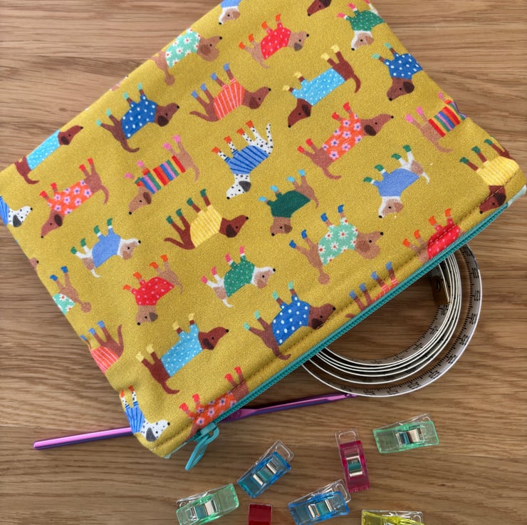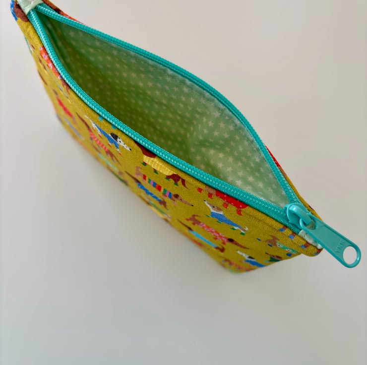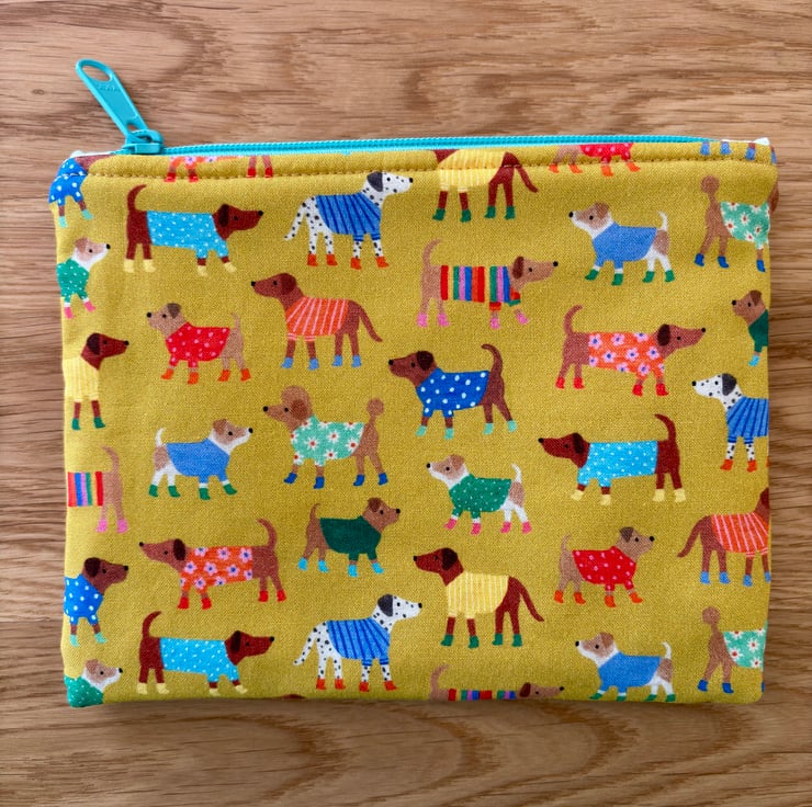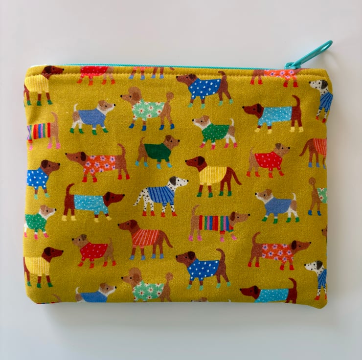 Handmade zipped fabric pouch in gold cotton fabric with bright multi coloured dogs - a fun print for any dog lovers.