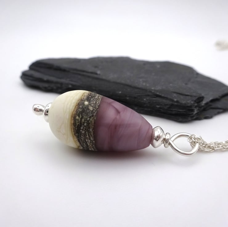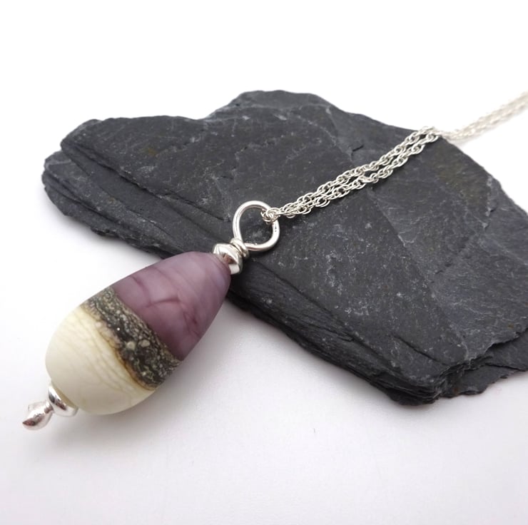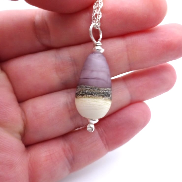 A sterling silver chain necklace which features a handmade lampwork glass purple and ivory pendant in the shape of a teardrop.