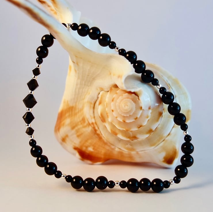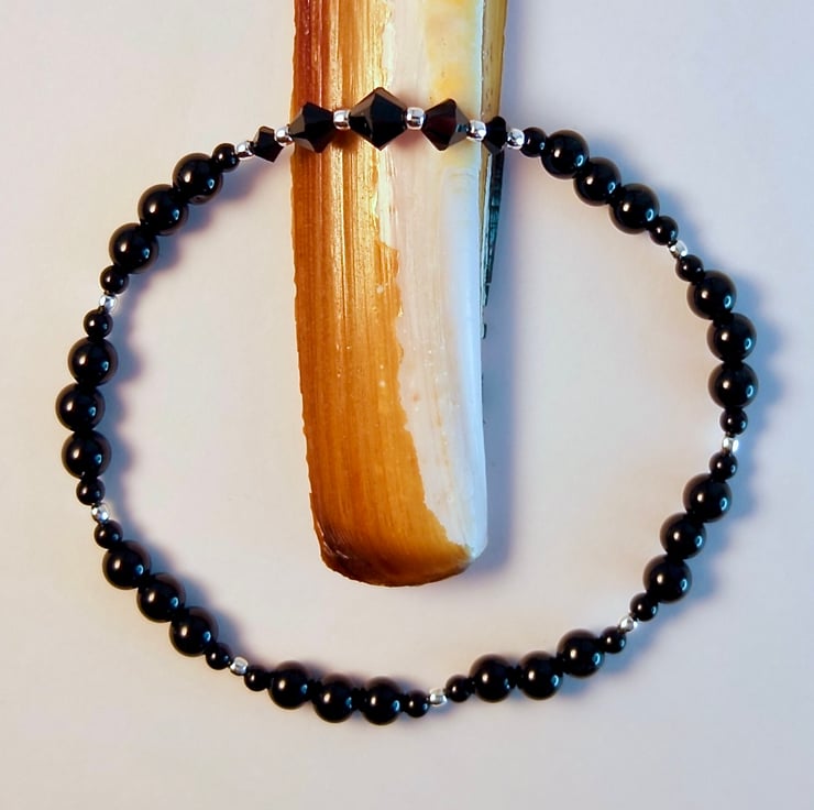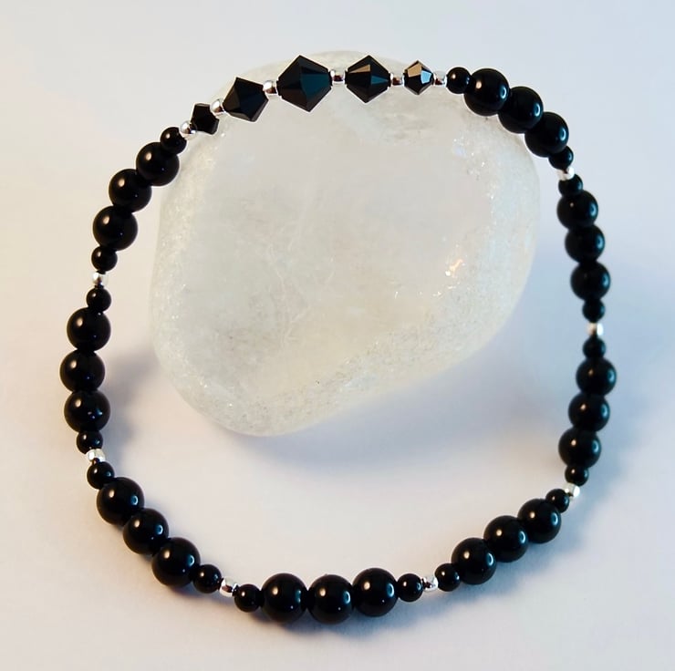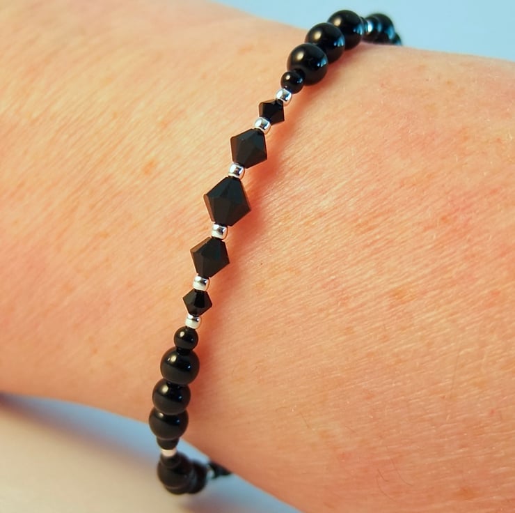 Dainty and versatile black Onyx bracelet set with 'jet' crystals and sterling silver.