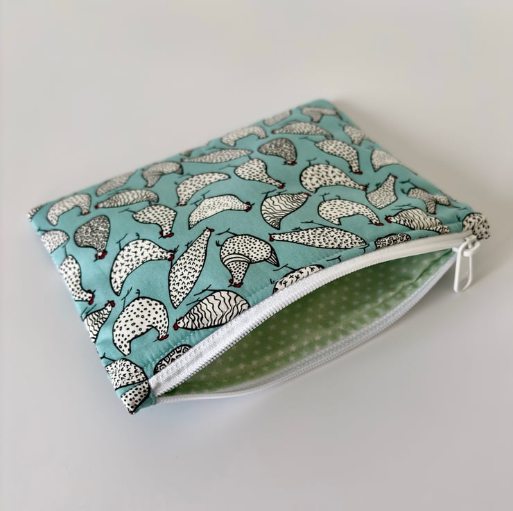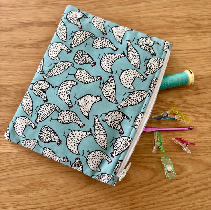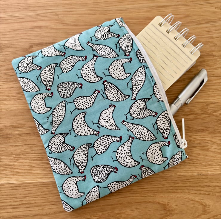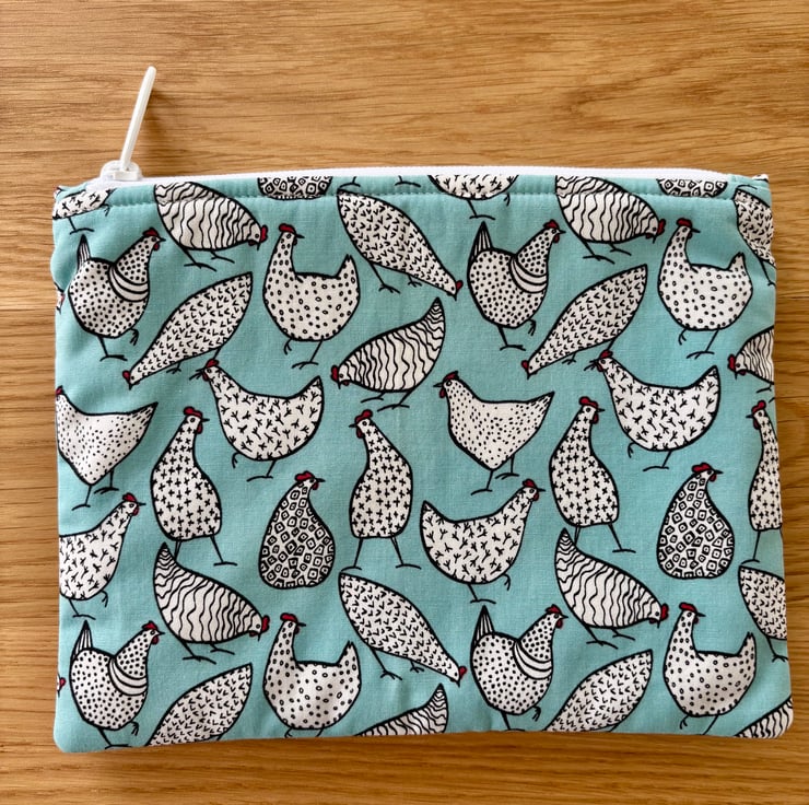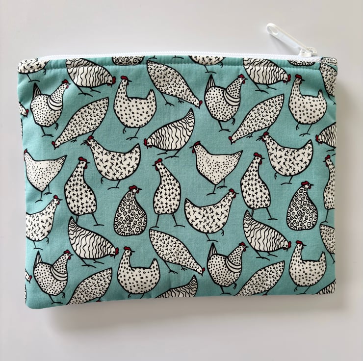 Handmade zipped fabric pouch in blue cotton fabric with white and black chickens - a fun print for any animal lovers.