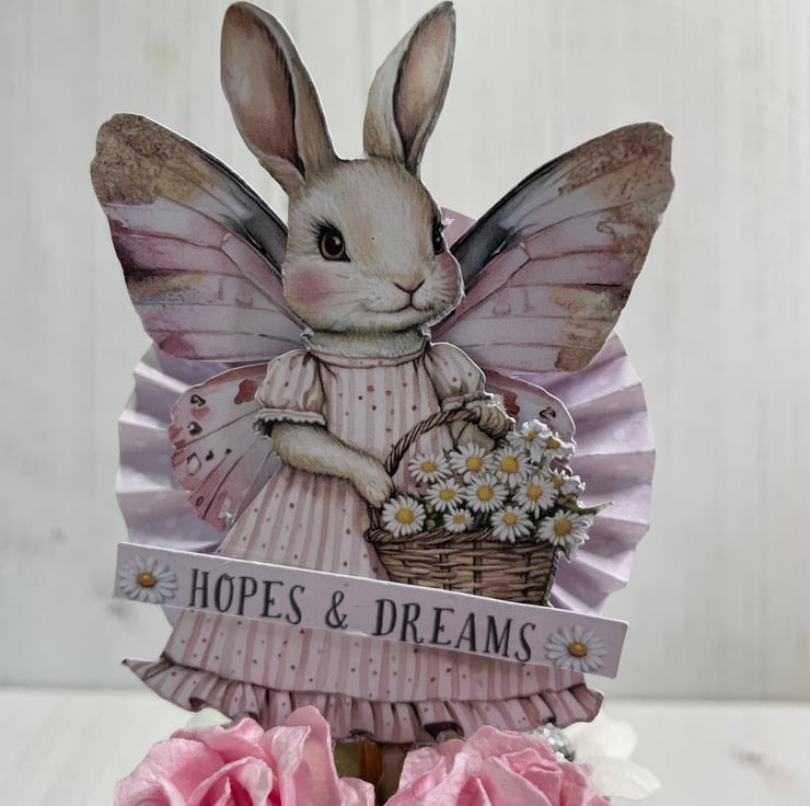 Wooden 2" cube decorated with bunny papers, topped with a bunny in a dress holding daisies. Roses and Flowers added round the top of the block. Rosette flower, butterfly wings and flowers added on the back. Wording: Hopes & Dreams.