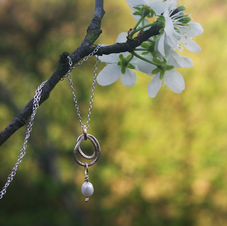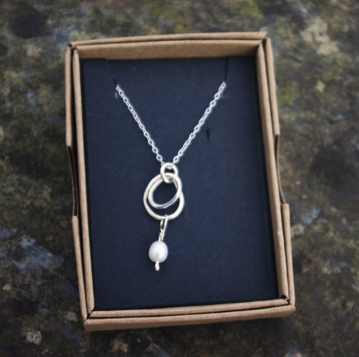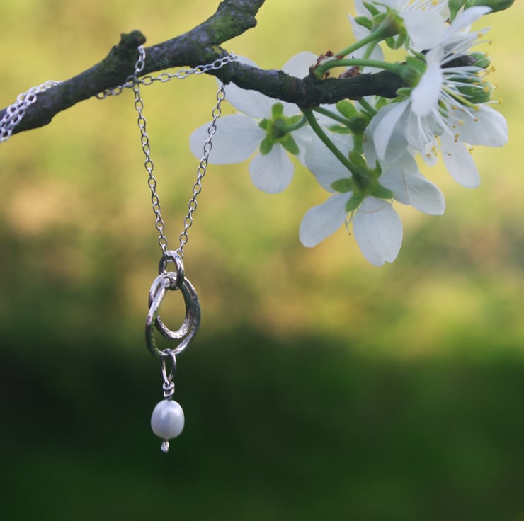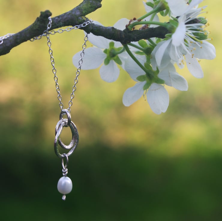 A silver swirl made from square sterling silver wire. The ends of the swirl join together and a good quality freshwater pearl dangles from the swirl on a piece of sterling silver wire which is securely wound around itself, to stop the pearl from falling off.