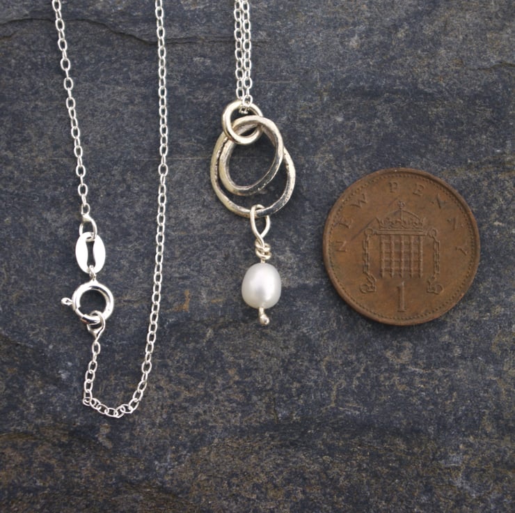 The pearl is roughly 6mmx 5mm and the total length of the pendant is 28mm/ just over an inch. The chain is a sterling silver trace chain and you can choose a length in the options box from 16 inches/ 40cm or 18 inches / 45cm.