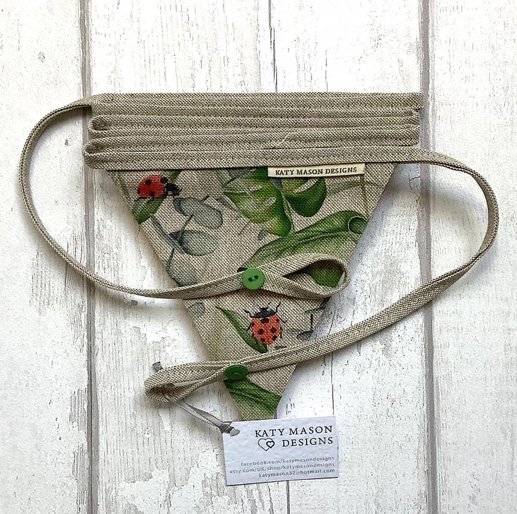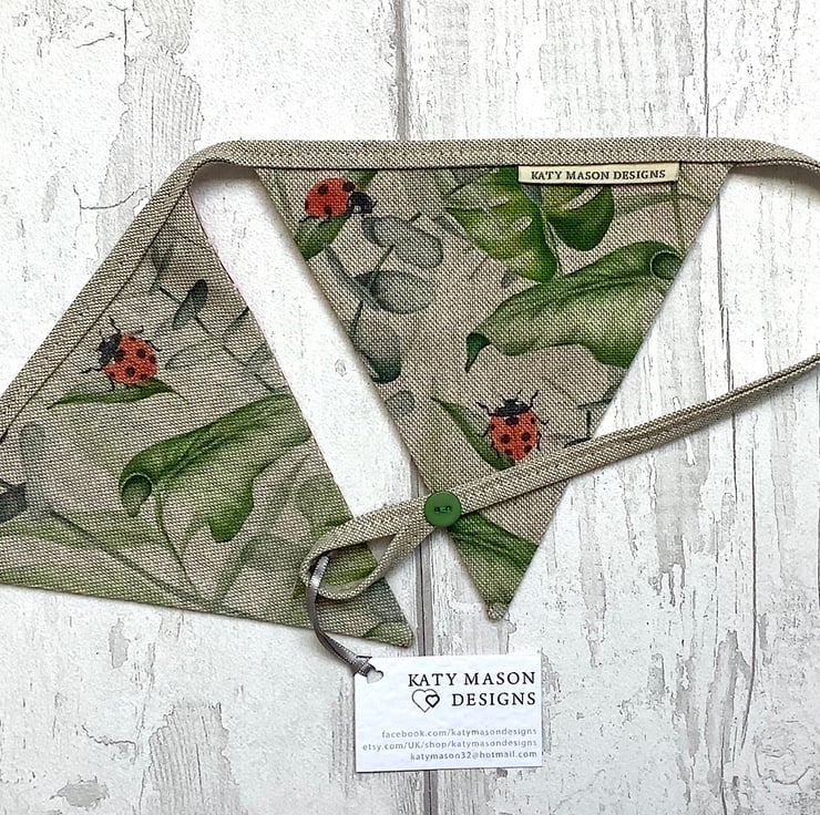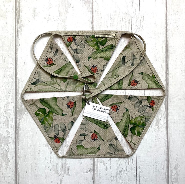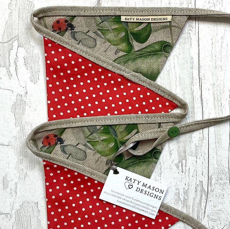 Botanical ladybird bunting with 7 flags. Backed in red spot cotton with hanging loops and button detail. 165cm from end to end.