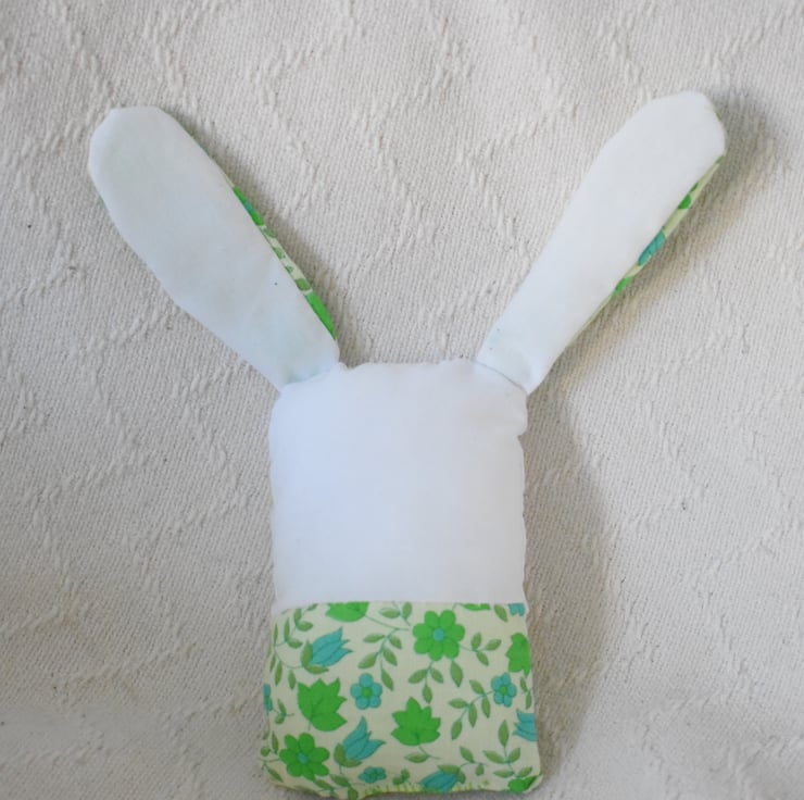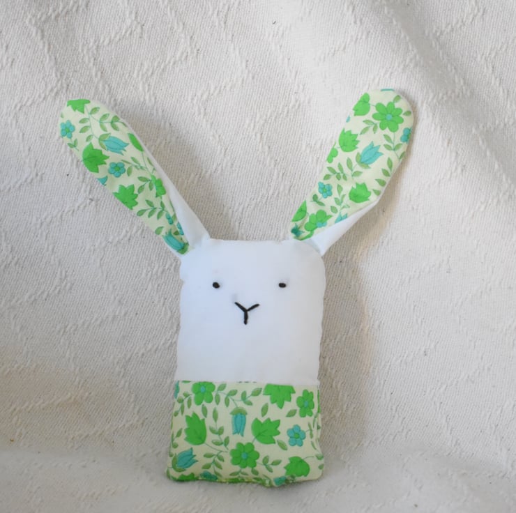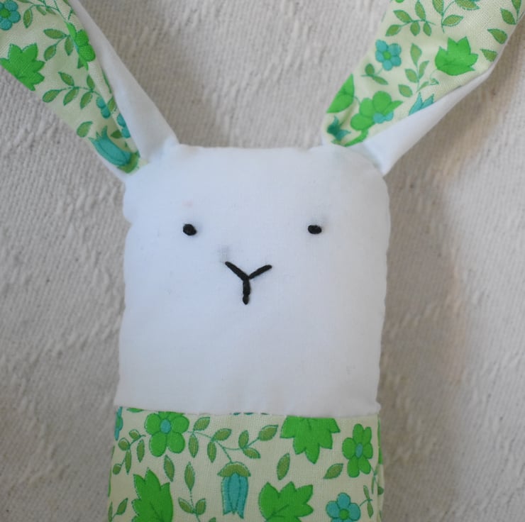 This adorable little bunny is made from white and green patterned cotton and stuffed full of love.