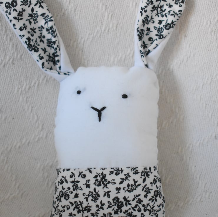 This adorable little bunny is made from white and black patterned cotton and stuffed full of love.