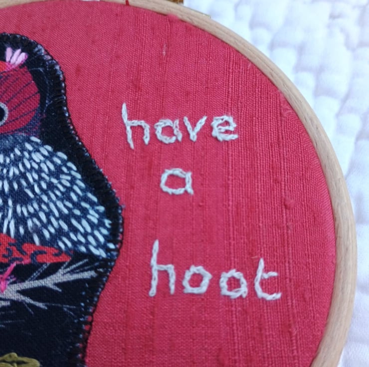 Zero waste - I set myself a challenge of making this entirely from offcuts and salvaged materials. The background silk is from bridemaids dresses made in the 1990s by my mother in law, the owl motif is cut from quilting cotton scraps, and the ribbon is an end of reel originally bought for stage costumes. Even the embroidery thread is short pieces left over from other projects. Ok, the hoop and backing felt are new, but I chose wood and wool - both sustainable materials