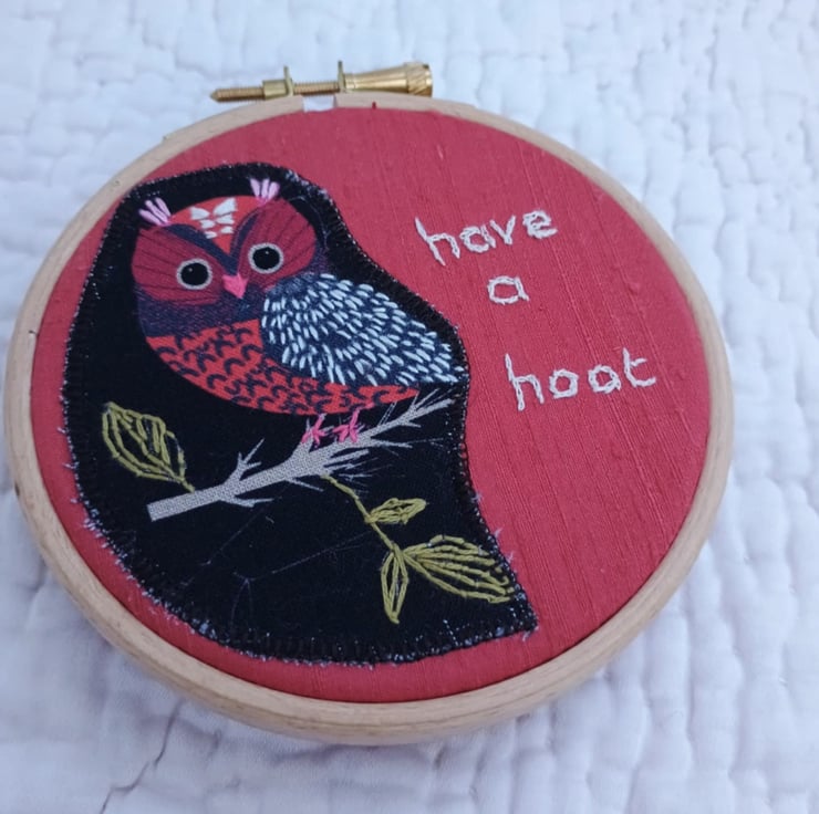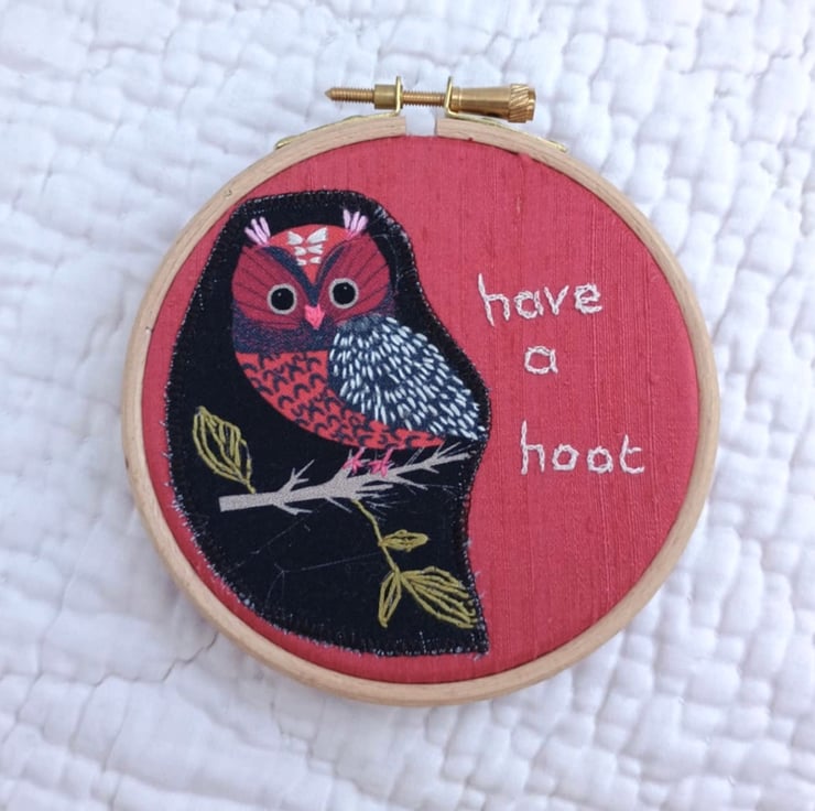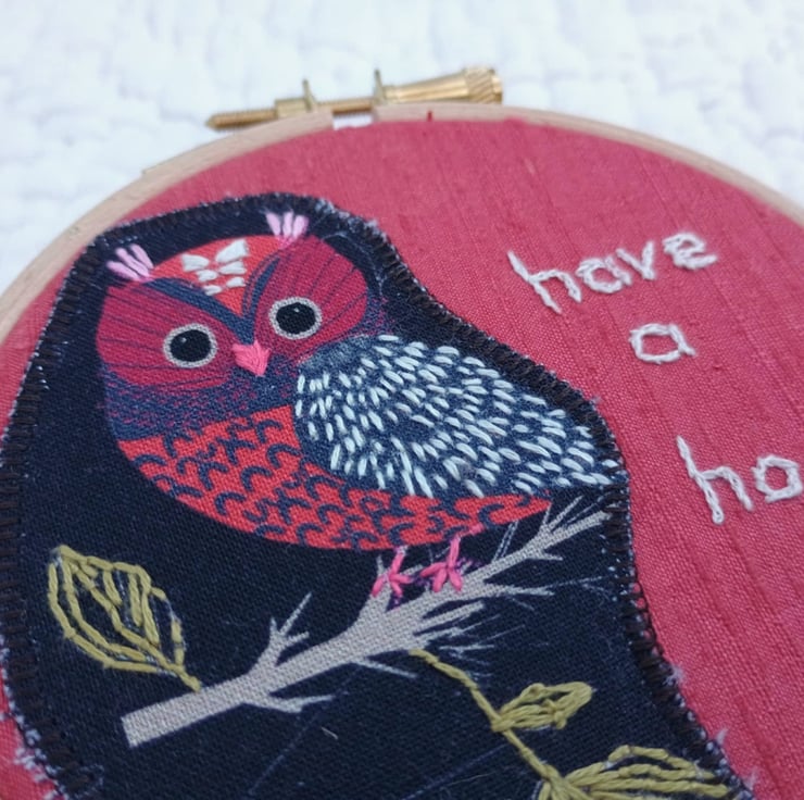 A stunning hoop art picture featuring an appliqued wise owl on a cerise pink raw silk background, hand embellished with embroidered features and the words "have a hoot". A lovely gift for teachers or students celebrating the end of the school year (or even exams) or a cute picture for a child's bedroom or nursery.