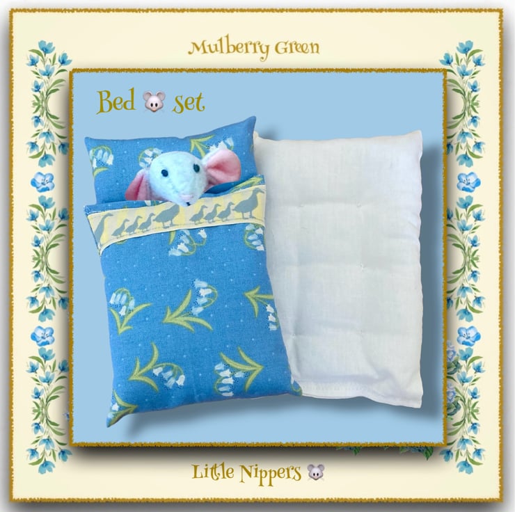 A cute little bed set that fits perfectly into the mouse boxes to make an adorable little bed for your mouse. The set consists of a mattress, a bluebells print cotton duvet, trimmed with dick print ribbon and a matching pillow. Perfect for your little mouse to take a nap.