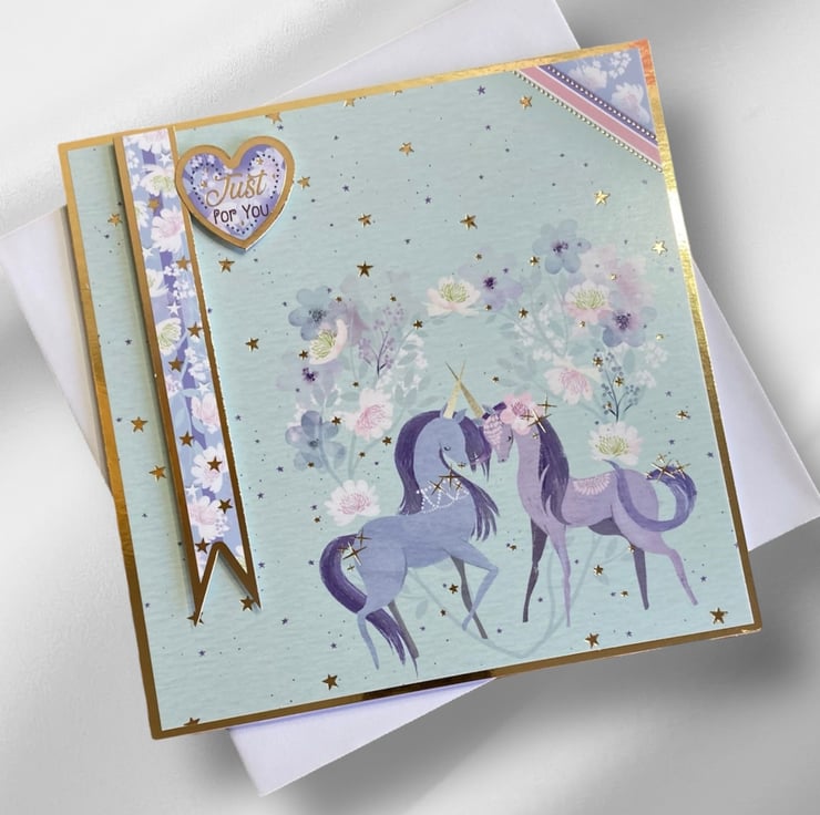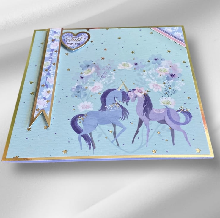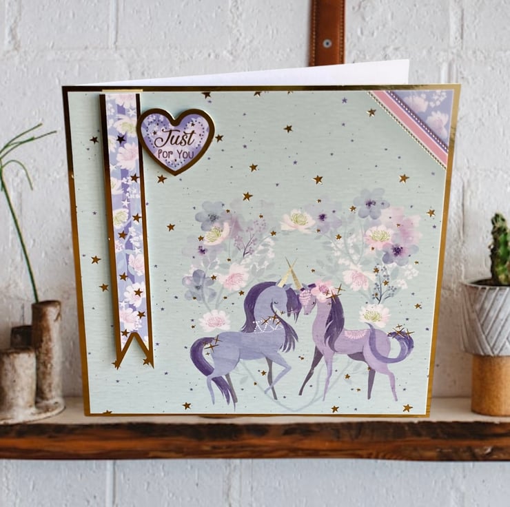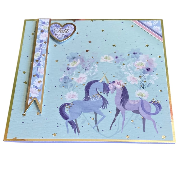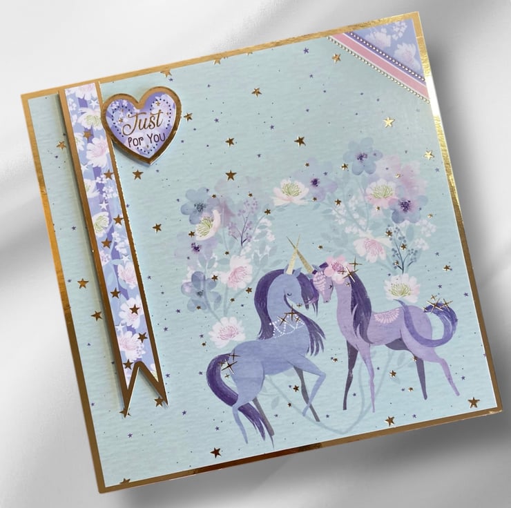 This sweet unicorn card has been made using a layering of gold mirror and card decorated with an image of unicorns surrounded by flowers and stars. A blue banner decorated with flowers and stars has been added in 3D. A topper has been added with the sentiment Just For You.