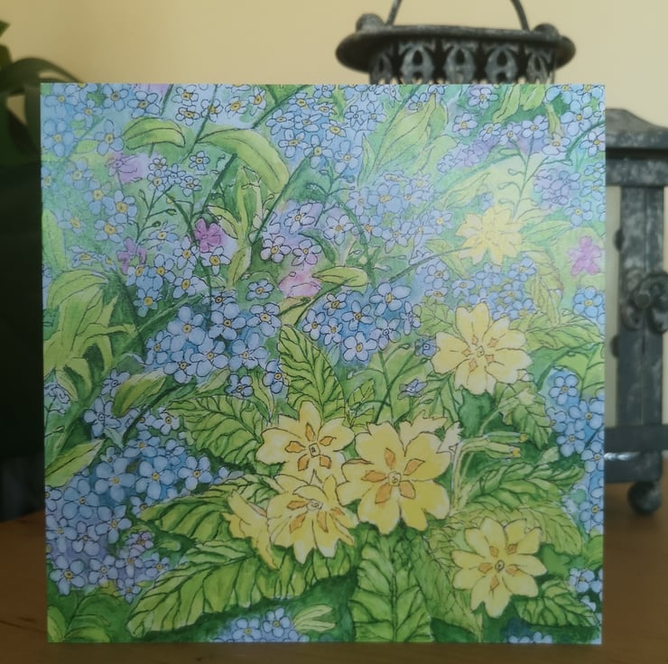 The painting that this card is printed from was first drawn in pen, as a sketch of the flowers growing in our garden. I then painted it in watercolour to try to capture the colours and joy that spring always brings to me.