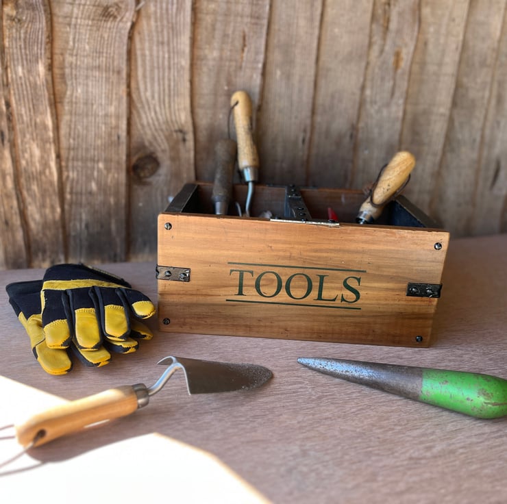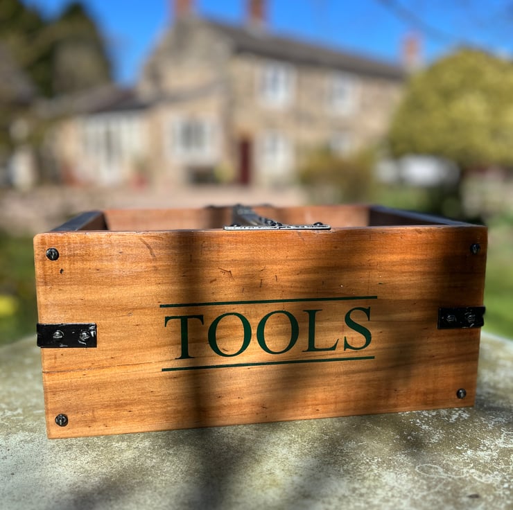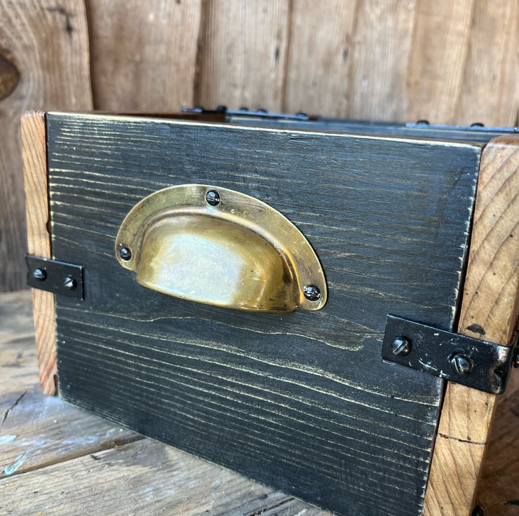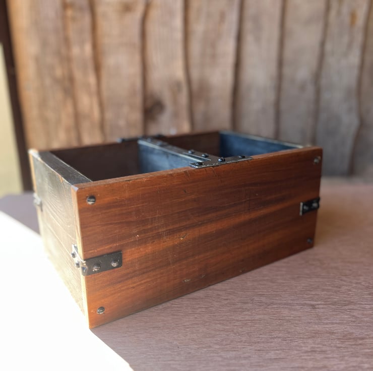 Made from a couple of pieces of salvaged wood. Lightly distressed but with a rustic patina The front and back might be mahogany or similar. The ends aren’t. There are genuine antique brass handles at each end ( not shown on some photos). It’s sturdy and decorative if you like that kind of thing or useful if you’ve got something to put in it. Measuring approx 12 1/2” x 8 1/2” x 6”. It has metal corner fixings and a central divider. The logo is in dark green.