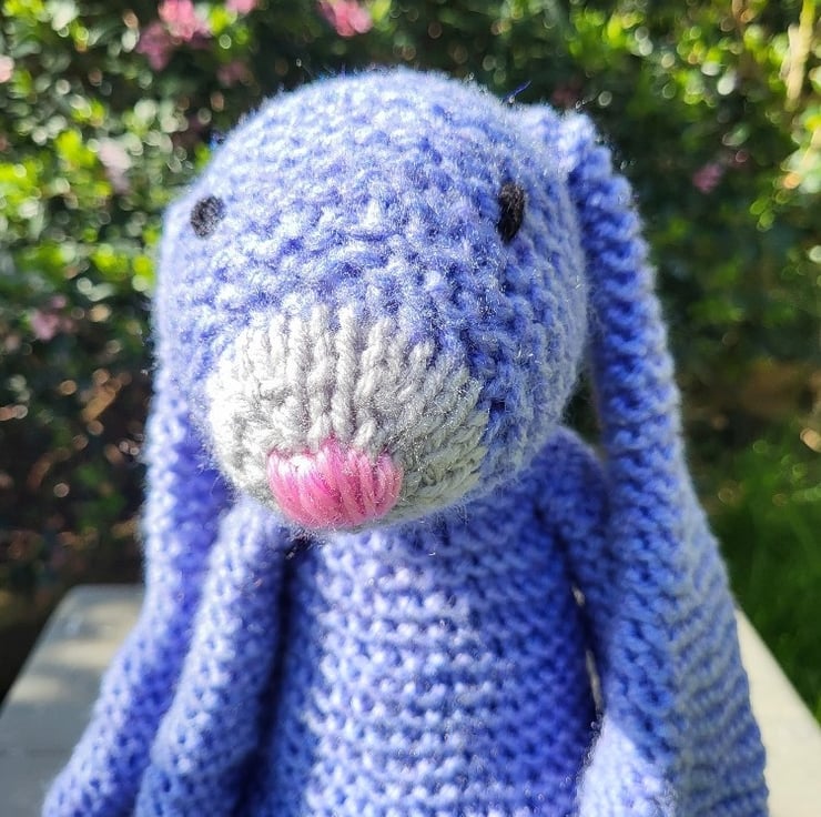 He is hand knitted in chunky blue yarn with grey paws, muzzle, fluffy pom-pom tail, and has a supper cute pink embroidered nose