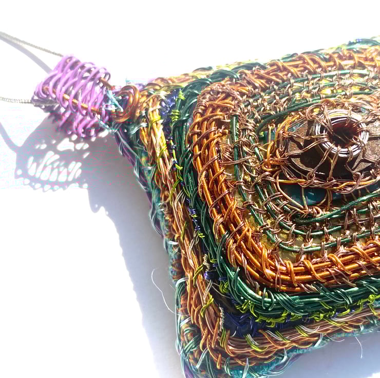 Very large square diamond pendant from reclaimed and recycled materials on silver plated snake chain, Television wire and bought wire, backed with blue 60s baby woollen blanket.