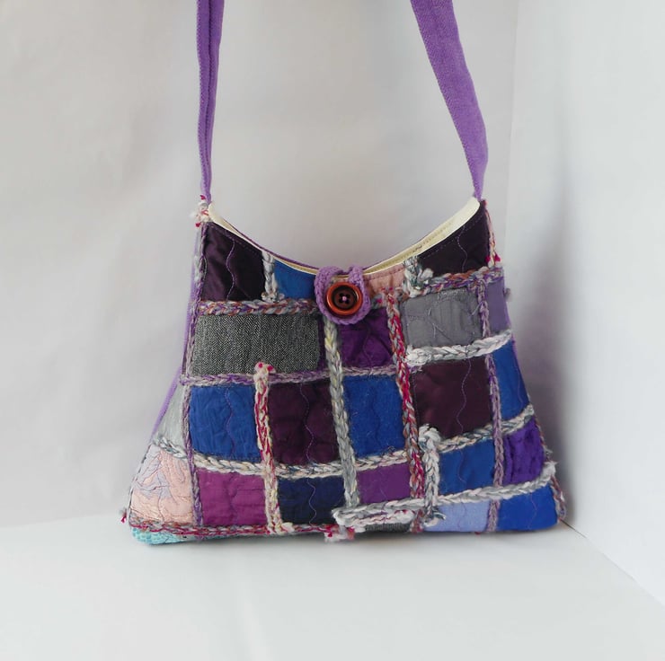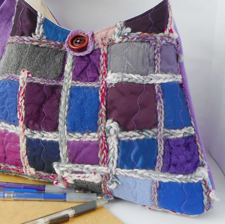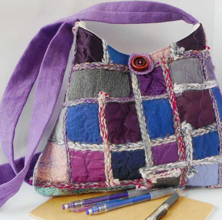 My textile art bags are constructed from a self-made fabric. I make these fabrics from off cuts and trimmings, and add decorative stitching and yarn features, often crocheting chains in interesting textures and colours. Zoom in on the photos for details.