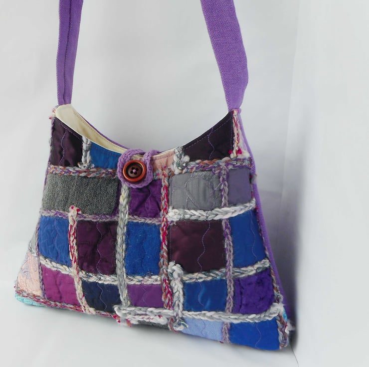 The shoulder strap and backing is a beautiful purple cotton interior furnishing fabric - an offcut from a curtain maker. Thistle fastens with a simple crochet loop and a vintage button, and is fully lined in ivory polycotton.