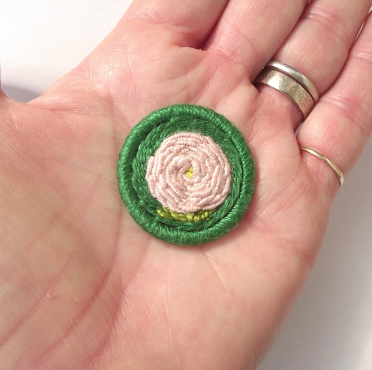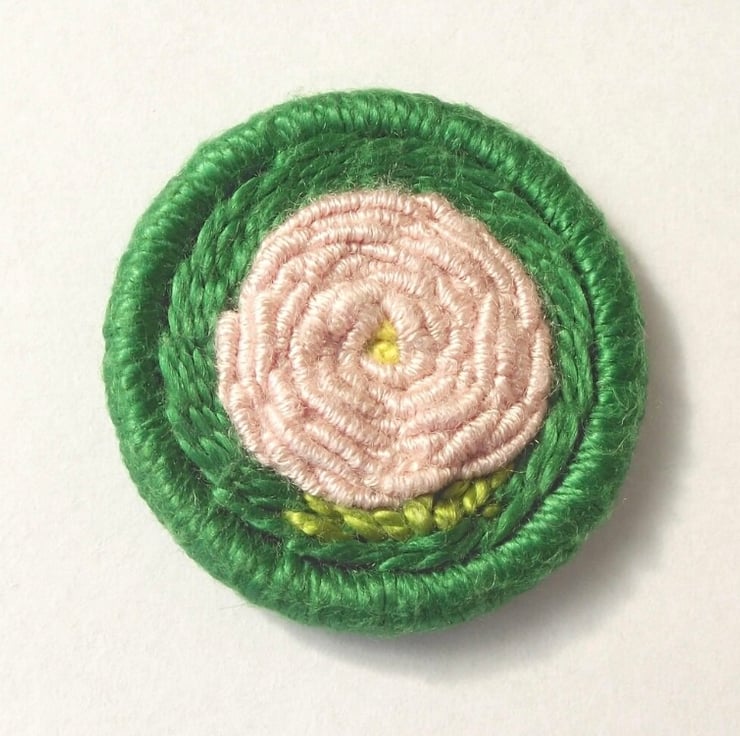 This listing is for a 3.5cm Dorset button brooch or pin. I made this by using various techniques of working cotton thread around a brass ring, forming a peach rose. There are also two green leaves. This is all set on a green background. I have attached a silver plated brooch back for easy attachment to clothing, bags etc.