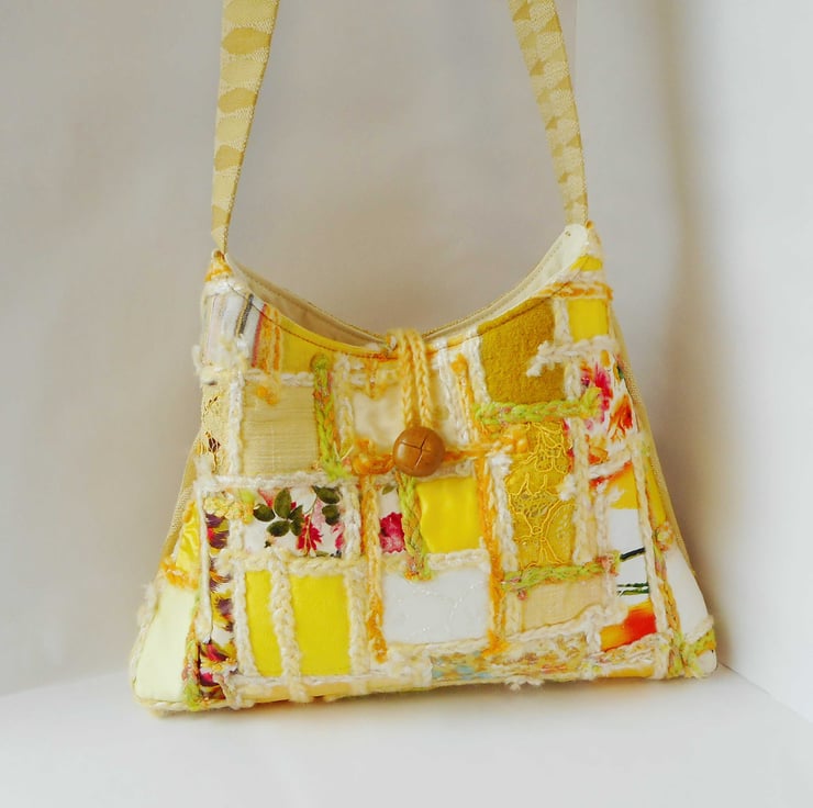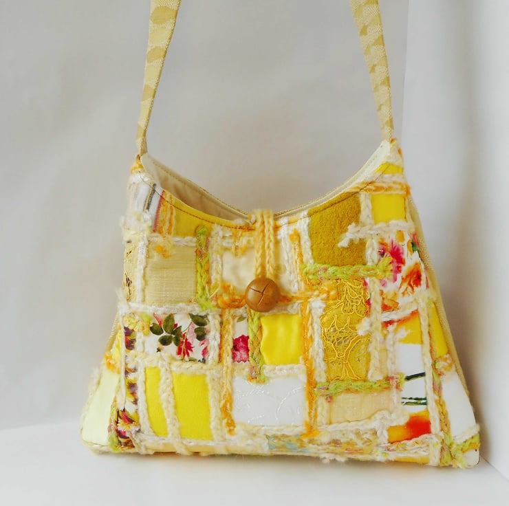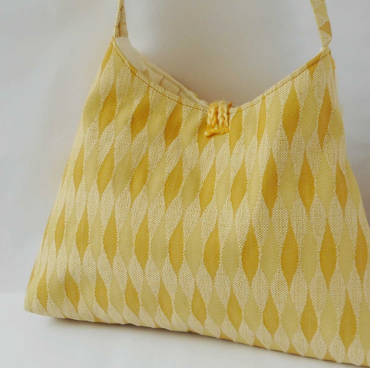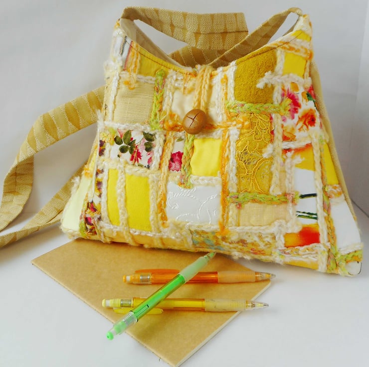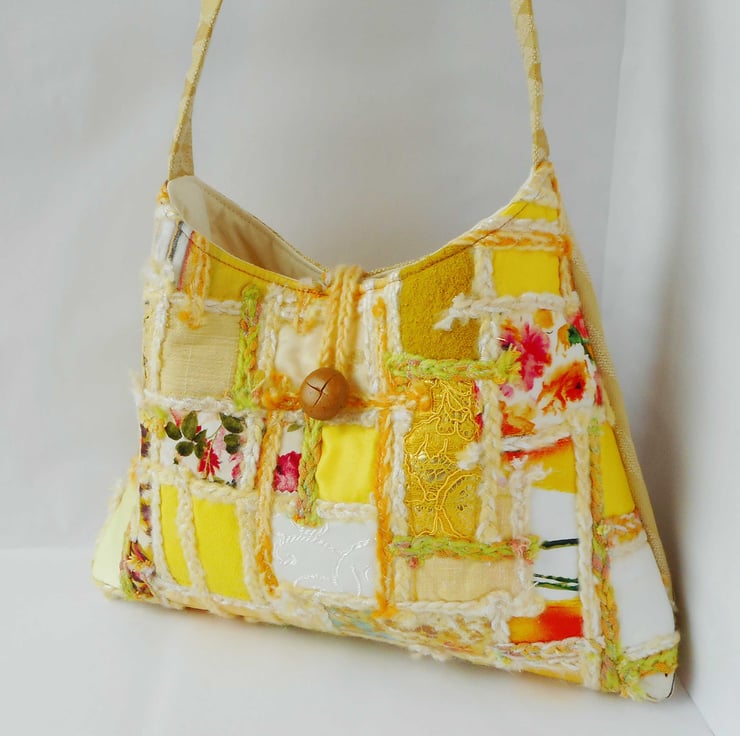 Yarrow bag. Yarrow is sunshine on your shoulders! Made in my signature pyramid bag shape, this time in shades of yellow, gold, white and hints of sunset orange.