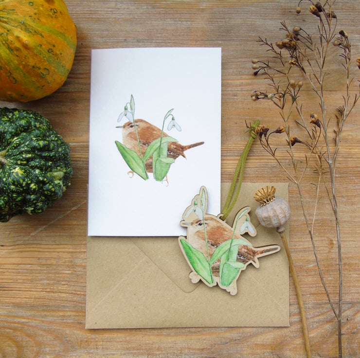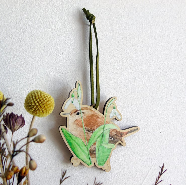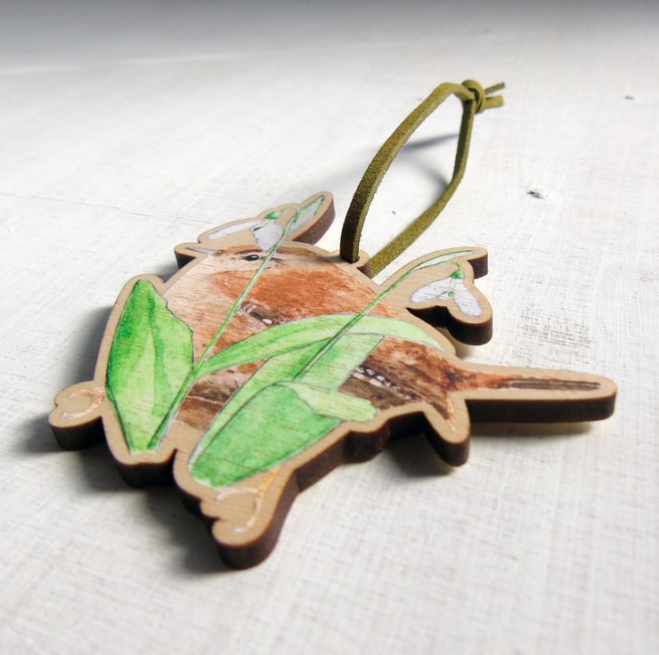 A cute hanging decoration featuring my watercolour painting of a little wren amongst the snowdrops.