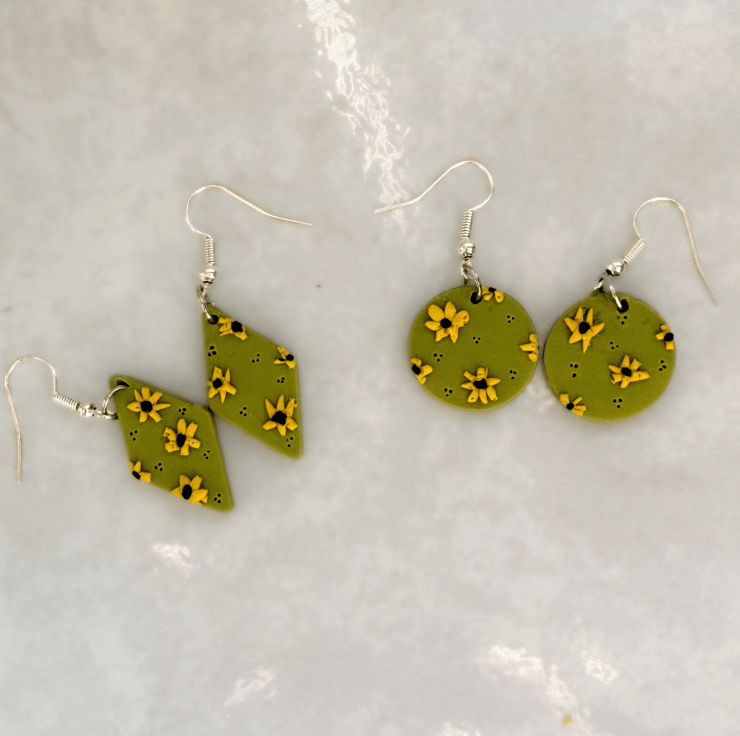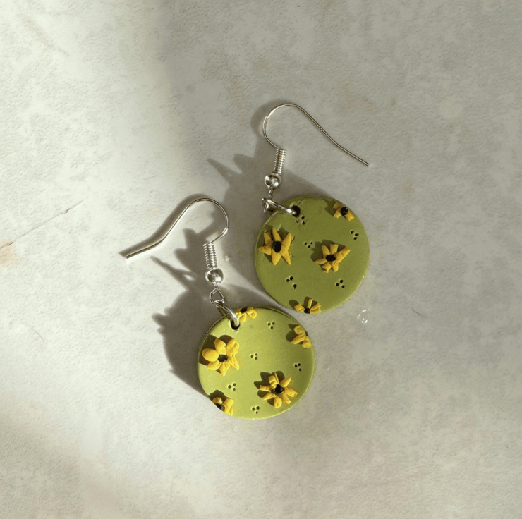 Add a touch of nature-inspired charm to your outfit with these adorable handmade polymer clay earrings! Featuring a cheerful yellow floral design on a soft olive green background, Made with hypoallergenic stainless steel fixtures and polymer clay, they're lightweight , fun, and perfect for everyday wear.