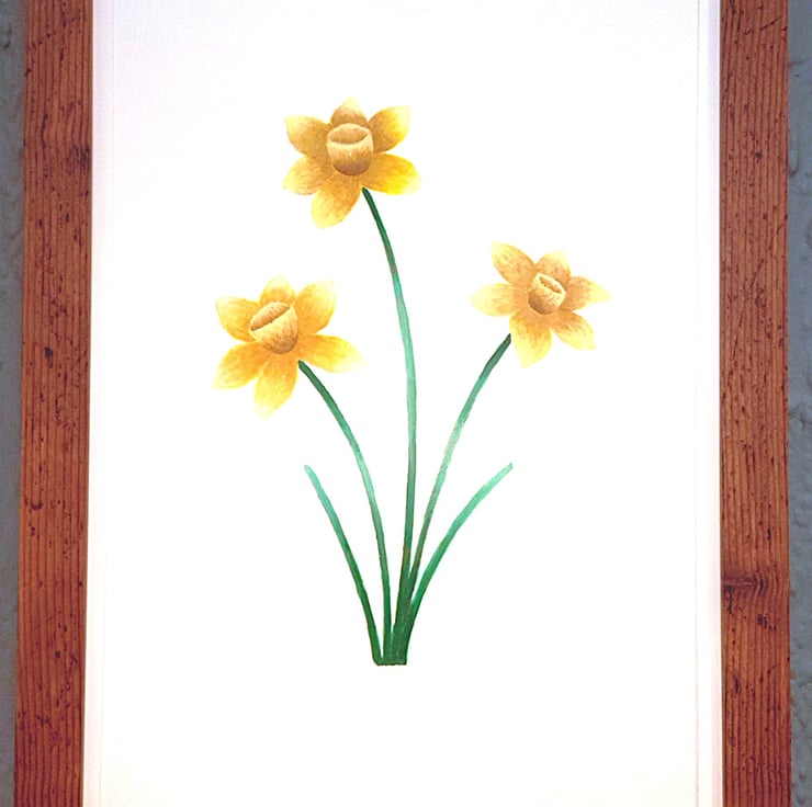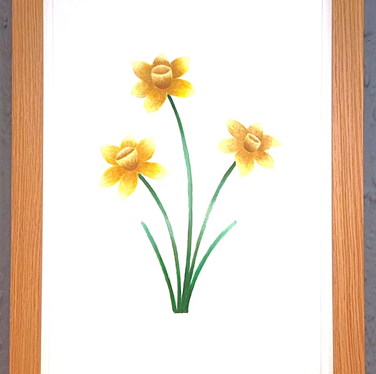 Framed high-quality coloured A3 print of my painting of yellow daffodils on a white background with a hard backing. The print comes finished with a stylish, contemporary white border. Framed with an expensive Styrene Protective Perspex (which has same clarity of glass) ready to hang. Choose from three different types of frame; black, oak or dark oak(see images). Colours of print and border may differ slightly due to computer/phone settings. All purchases delivered within 7-10 working days.