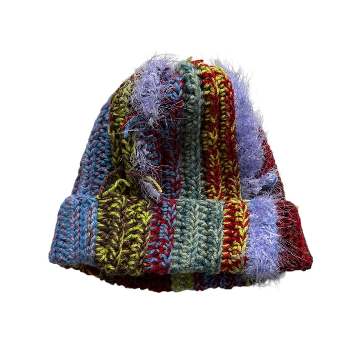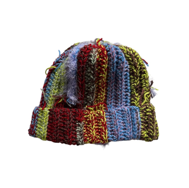 Material: Made from various yarn scraps. The knit fabric has some stretch, making it suitable for different head sizes.