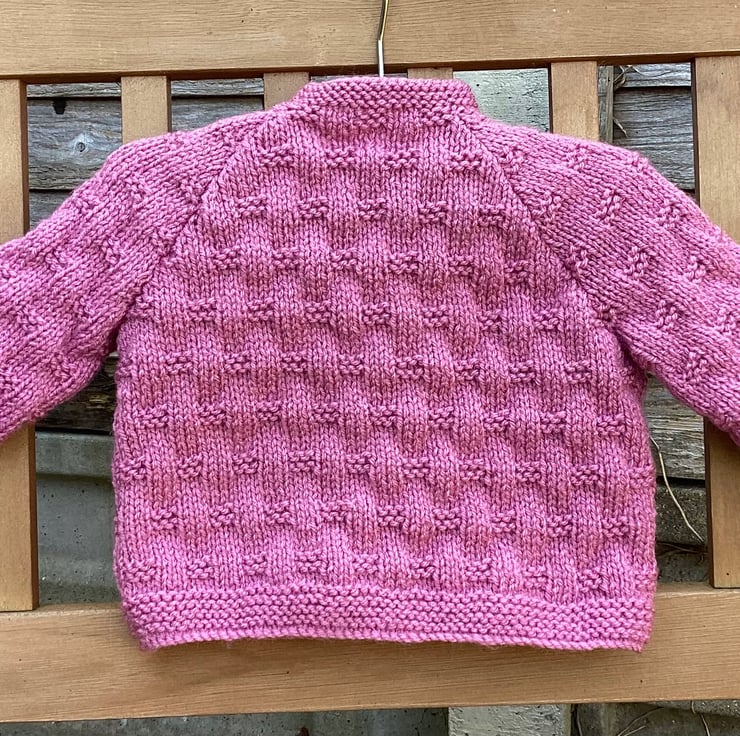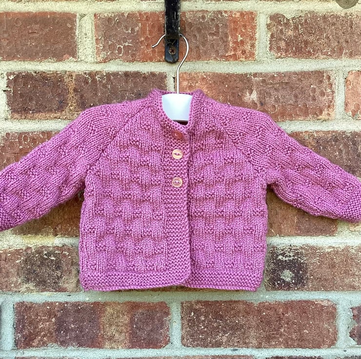 Lovely traditional style baby cardigan hand knitted by me at home in Suffolk. I love the gorgeous dusky rose pink colour of this good quality acrylic baby yarn, the perfect shade for a little one. Fastens with three matching baby buttons. Knitted to fit a baby from birth to three months approximately but please use these actual garment measurements as a guide.
