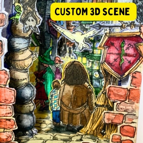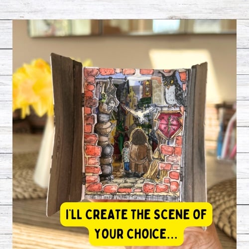 Let me create a personalised 3D illustrated scene for you to treasure or give as a unique gift. Each layer of the scene will be painstakingly drawn, painted and then carefully cut by hand and assembled, to create the perfect diorama. This can then be presented either as a framed piece of art or as a freestanding 'tunnel book', to be picked up.