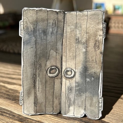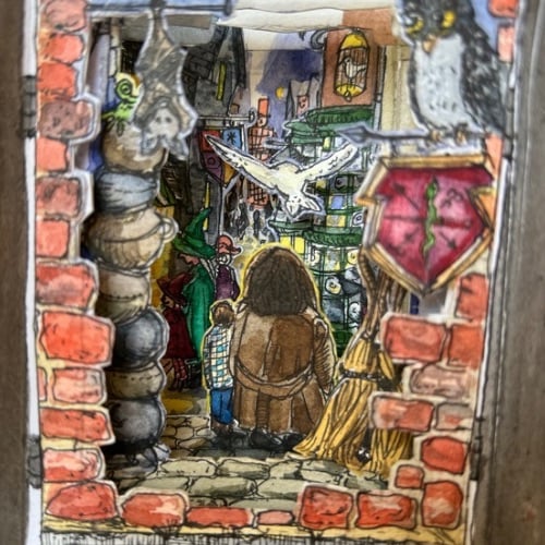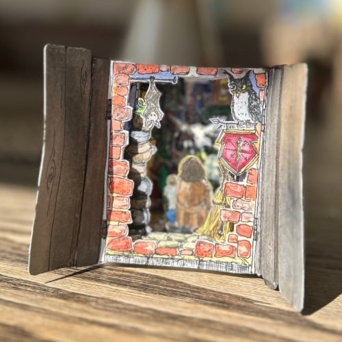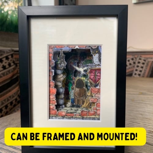 Unframed - the construction of your 'tunnel book' means it will happily stand on a shelf, desk or other flat surface - enabling you to pick it up and easily peek into all the nooks and crannies…maybe you will discover a hidden detail there! Opening doors/windows can be a feature of these.