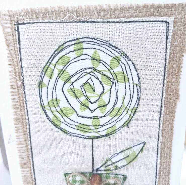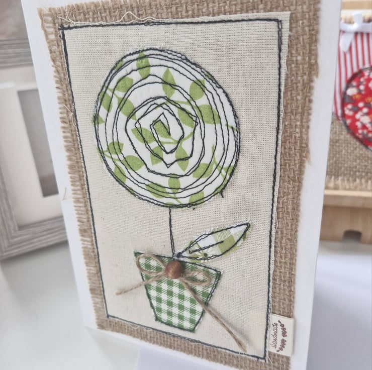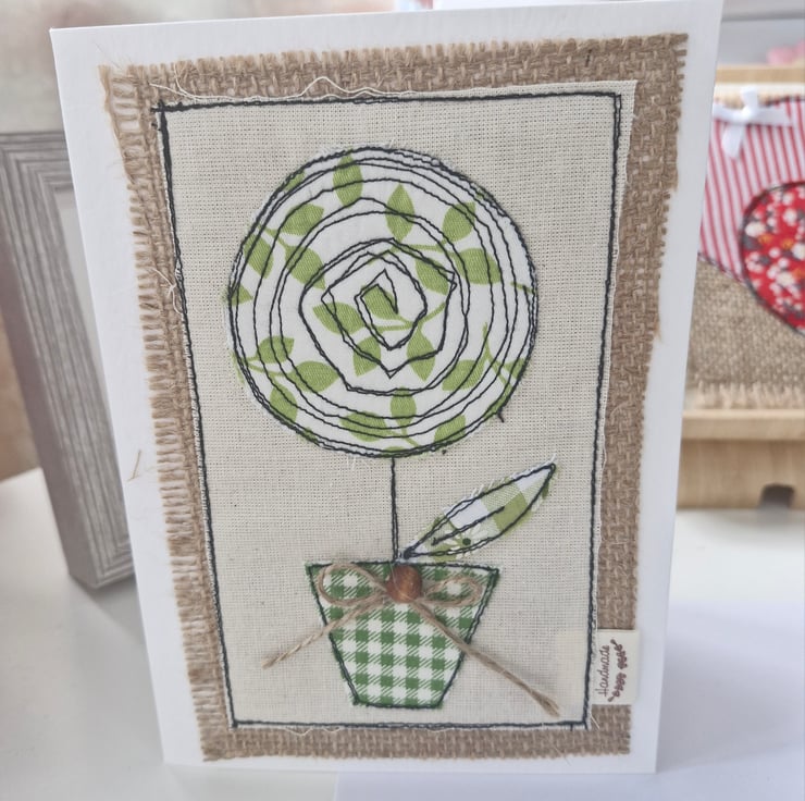 A high quality card, this features a pretty flower in a pot design. Using a free motion embroidery technique, the card has been decorated with hessian string bow.