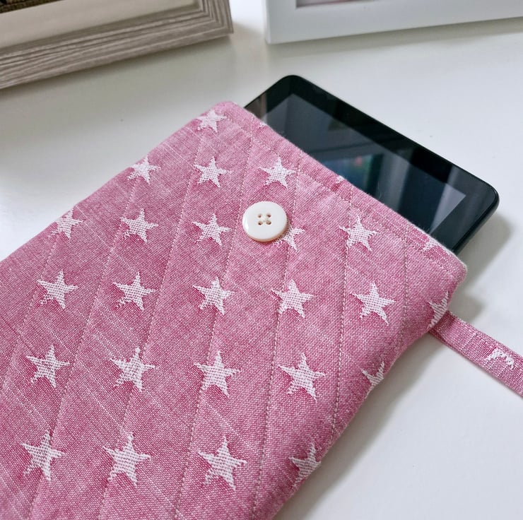 Professionally handmade using high quality fabrics, The sleeve is crafted with lovely pink fabric featuring a funky star design. It is fully padded and finished using a diamond quilting technique. Inside is fully lined with a complimentary cotton. Elastic and button closure secures your eReader.