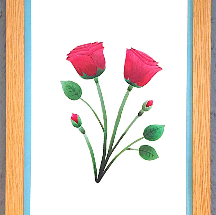 This is a framed high-quality coloured A3 print of a painting of red roses on a white background with a hard backing. The print comes finished with a contemporary light blue border. Framed with an expensive Styrene Protective Perspex (which has same clarity of glass) ready to hang. Choose from three different types of frame; black, oak or dark oak(see images). Colours of print and border may differ slightly due to computer/phone settings. All purchases delivered within 7-10 working days.