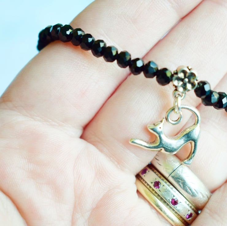 Black Bead Bracelet with Stretching Cat Charm