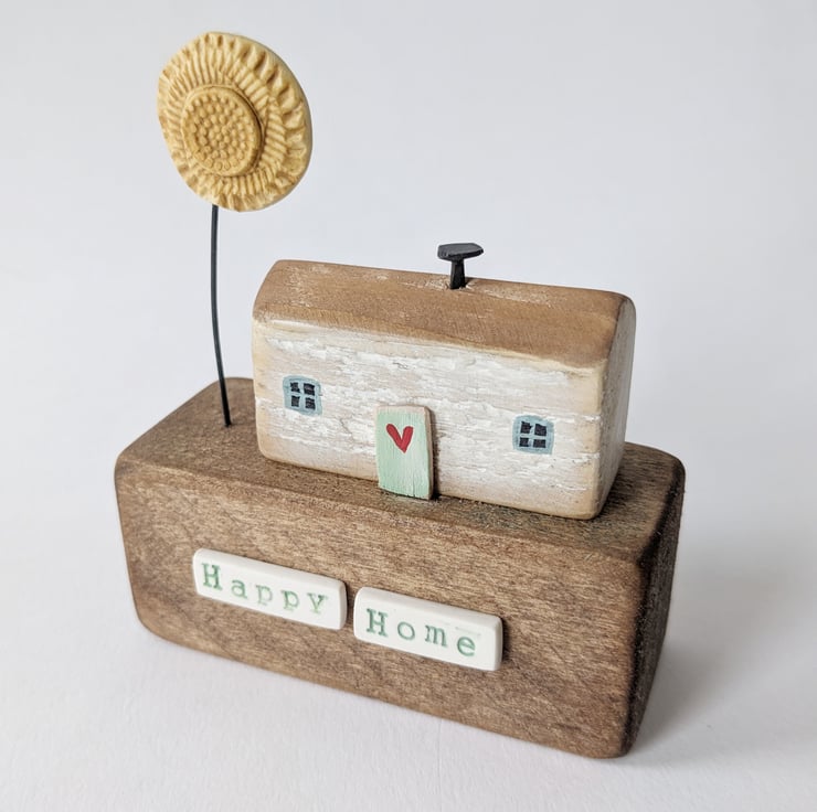 This is one of my little houses, sitting on a lovely reclaimed wooden block. A jolly handmade clay tree finishes the scene.