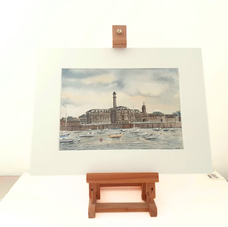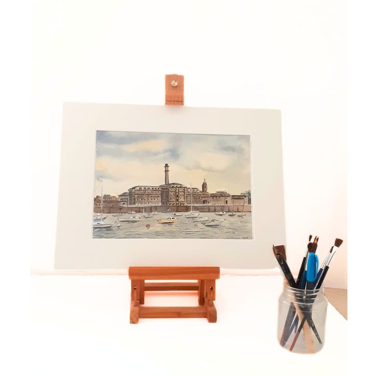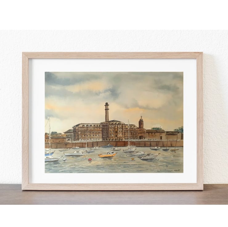 This is an original watercolour and ink painting of Plymouth's famous Royal William Yard, a former naval storage facility, now a vibrant waterfront tourist attraction. Inspired by my own photographs, viewed from the Cremyll ferry slipway.