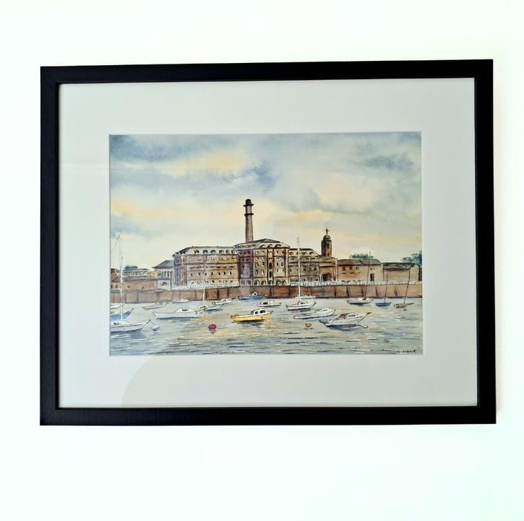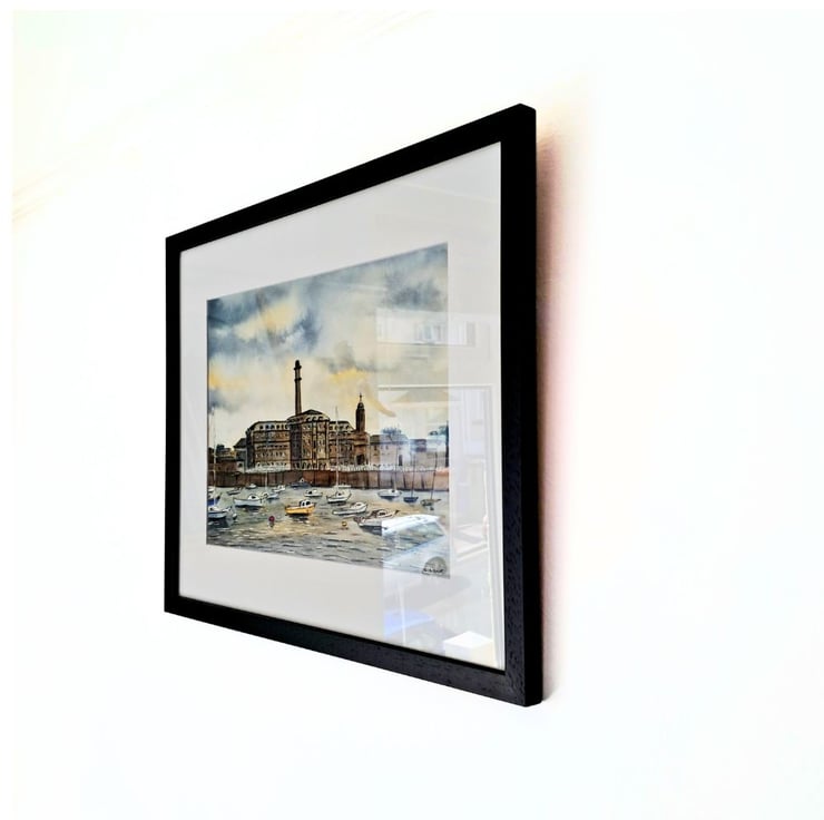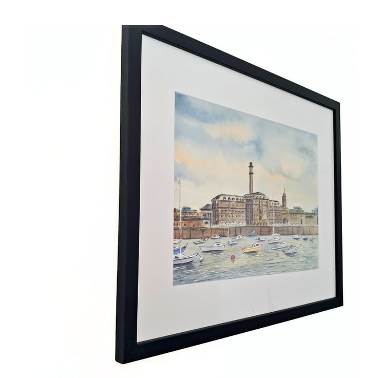 This is an original watercolour and ink painting of Plymouth's famous Royal William Yard, a former naval storage facility, now a vibrant waterfront tourist attraction. Inspired by my own photographs, viewed from the Cremyll ferry slipway. Professionally framed and ready to hang in a black wooden glazed frame.