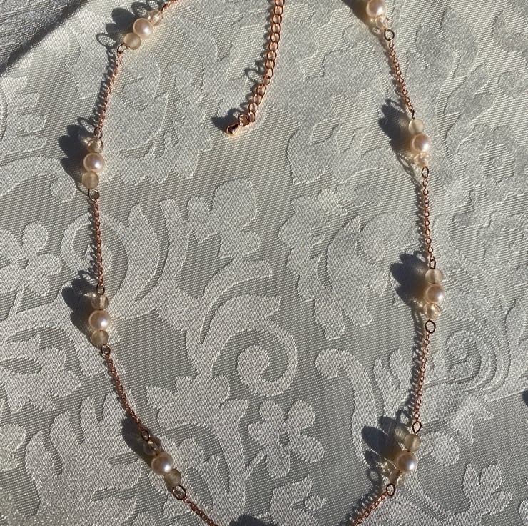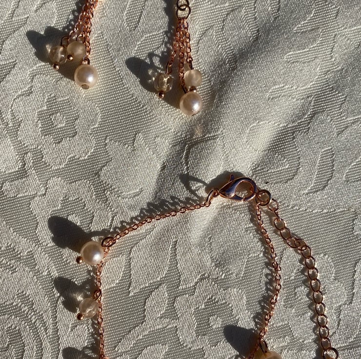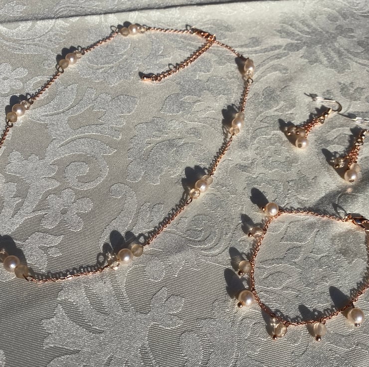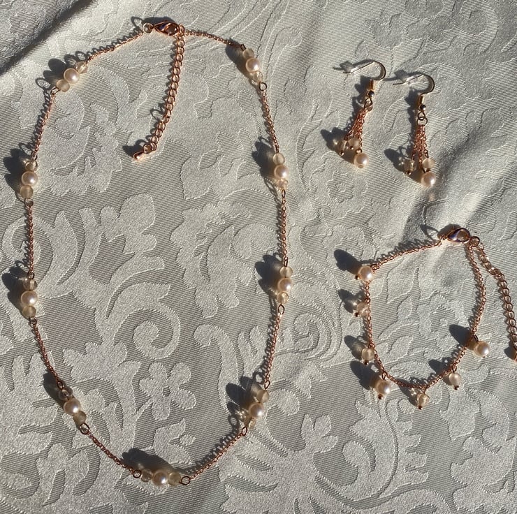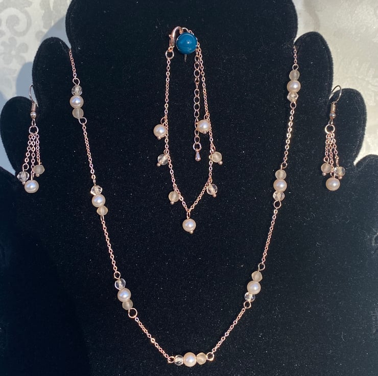 Matching necklace,bracelet & earrings set made from recycled faux pearls/crystals with new rose gold coloured findings.
