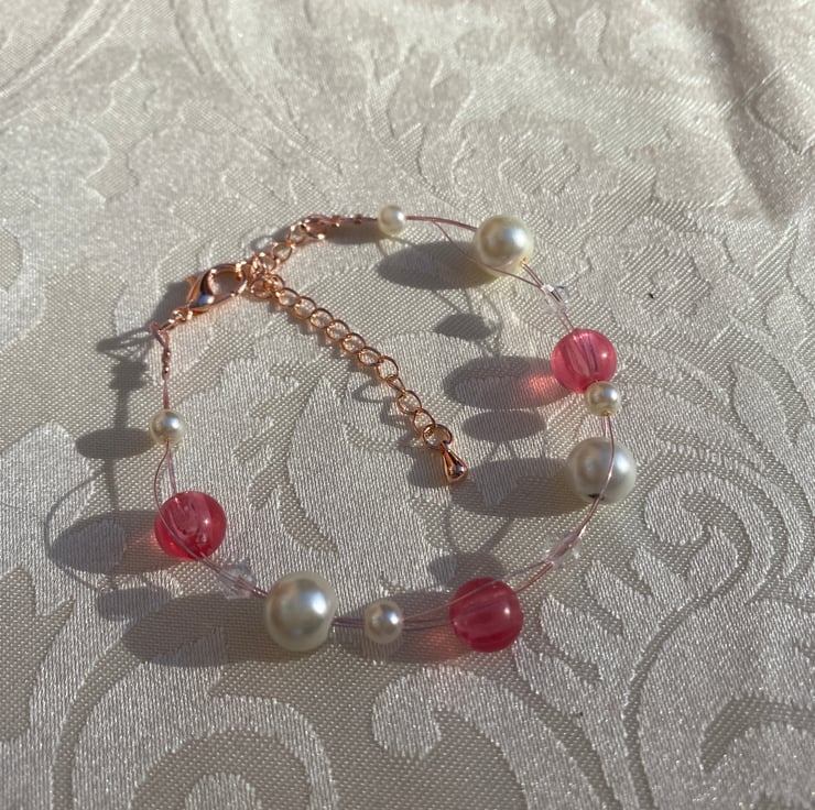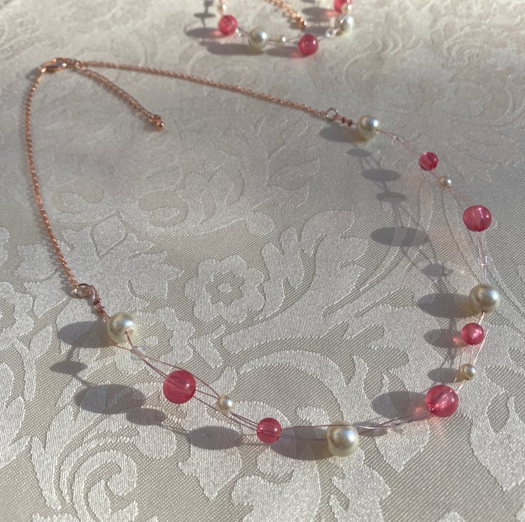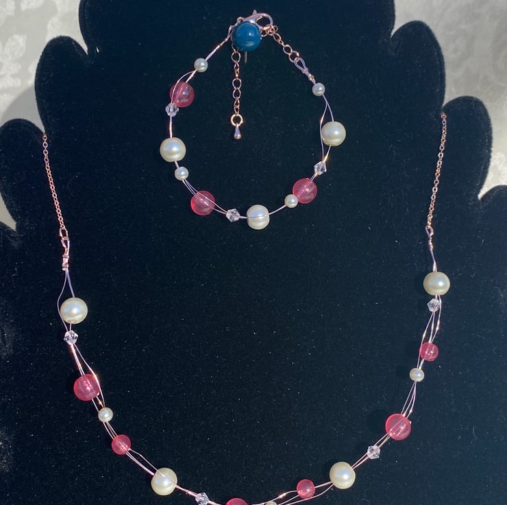 Floating style necklace & bracelet set with pink beads and faux pearls on rose gold coloured findings.