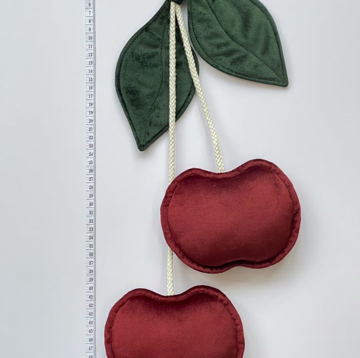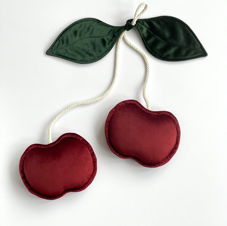 Crafted from plush velvet fabric, each cherry is sewn with care and attention to detail. The two cherries are connected by a soft cotton cord and finished with a pair of beautifully shaped leaves, giving the piece an organic, almost storybook feel.