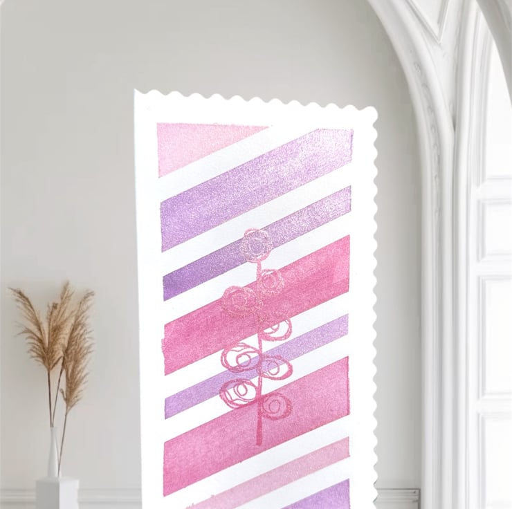 Perfect for any occasion. A Beautiful pink abstract floral swirl sits atop hand painted diagonal stripes in various shades of pinks and purples on this tall card.