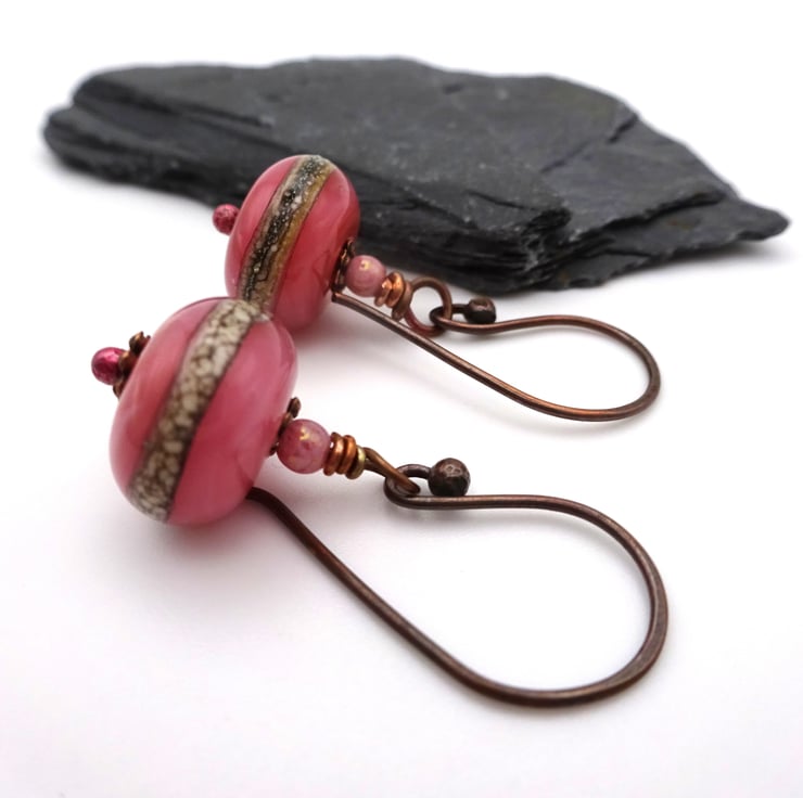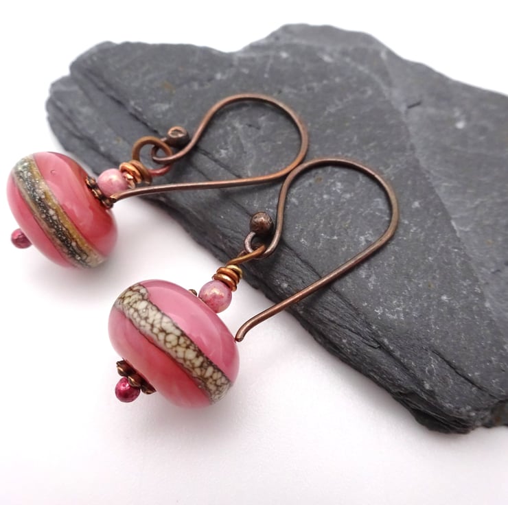 A pair of earrings made with handmade copper ear wires and handmade lampwork glass beads.